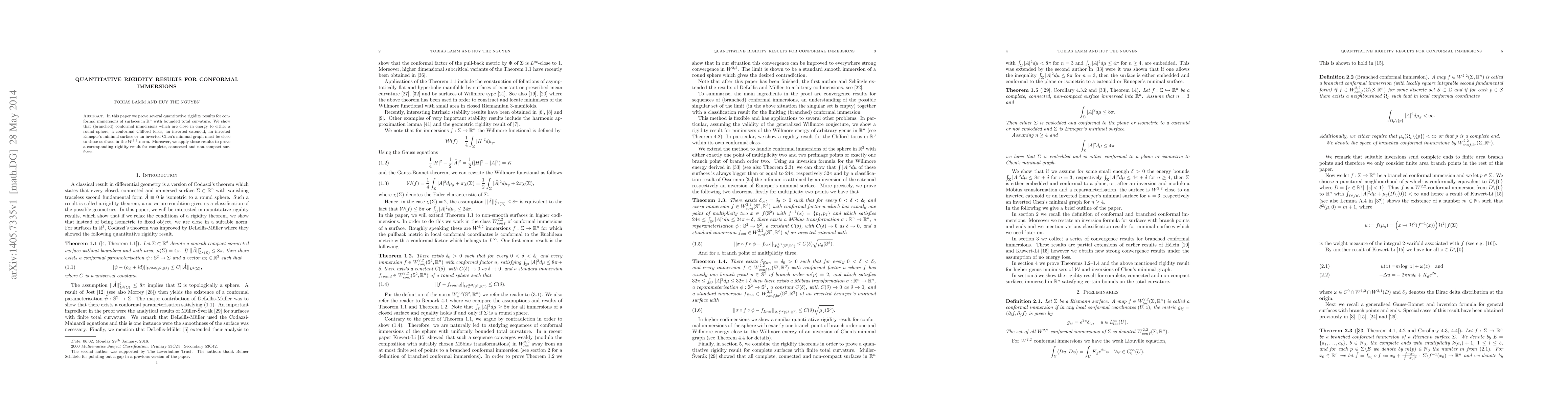 In this paper we prove several quantitative rigidity results for conformal immersions of surfaces in $\mathbb{R}^n$ with bounded total curvature. We show that (branched) conformal immersions which are close in energy to either a round sphere, a conformal Clifford torus, an inverted catenoid, an inverted Enneper's minimal surface or an inverted Chen's minimal graph must be close to these surfaces in the $W^{2,2}$-norm. Moreover, we apply these results to prove a corresponding rigidity result for complete, connected and non-compact surfaces.