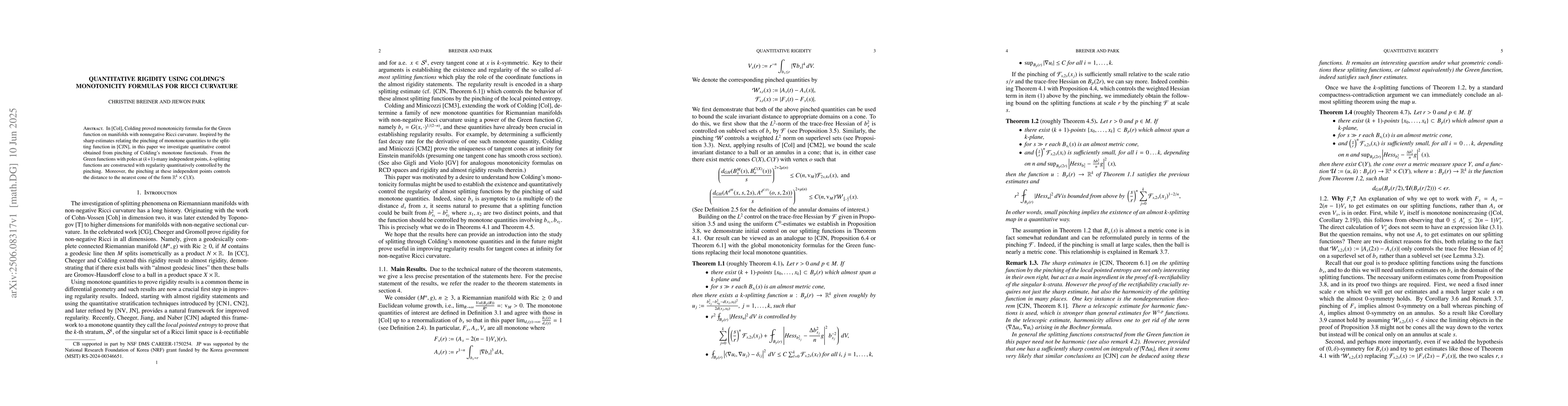 In \cite{Colding}, Colding proved monotonicity formulas for the Green function on manifolds with nonnegative Ricci curvature. Inspired by the sharp estimates relating the pinching of monotone quantities to the splitting function in \cite{cjn}, in this paper we investigate quantitative control obtained from pinching of Colding's monotone functionals. From the Green functions with poles at $(k+1)$-many independent points, $k$-splitting functions are constructed with regularity quantitatively controlled by the pinching. Moreover, the pinching at these independent points controls the distance to the nearest cone of the form $\mathbb{R}^k \times C(X)$.