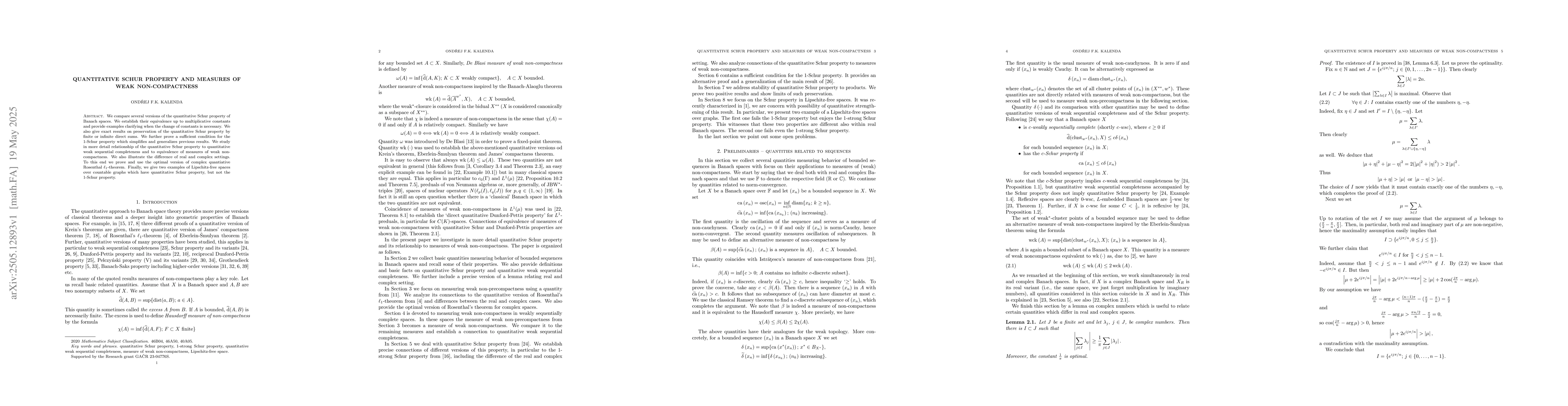 The paper presents equivalence results, a simplified sufficient condition for the 1-Schur property, and an optimal complex quantitative Rosenthal ℓ1-theorem, enhancing the understanding of weak non-compactness measures.