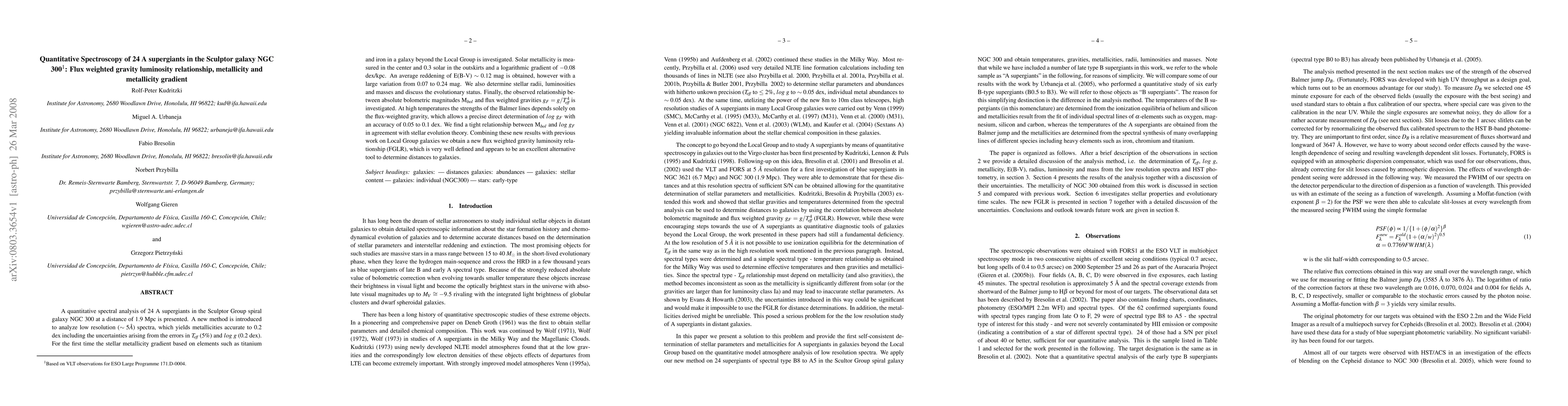 A quantitative spectral analysis of 24 A supergiants in the Sculptor Group spiral galaxy NGC 300 at a distance of 1.9 Mpc is presented. A new method is introduced to analyze low resolution (~5 AE) spectra, which yields metallicities accurate to 0.2 dex including the uncertainties arising from the errors in Teff (5%) and log g (0.2 dex). For the first time the stellar metallicity gradient based on elements such as titanium and iron in a galaxy beyond the Local Group is investigated. Solar metallicity is measured in the center and 0.3 solar in the outskirts and a logarithmic gradient of -0.08 dex/kpc. An average reddening of E(B-V)~0.12 mag is obtained, however with a large variation from 0.07 to 0.24 mag. We also determine stellar radii, luminosities and masses and discuss the evolutionary status. Finally, the observed relationship between absolute bolometric magnitudes M_{bol} and flux weighted gravities g_{F} = g/Teff^4 is investigated. At high temperatures the strengths of the Balmer lines depends solely on the flux-weighted gravity, which allows a precise direct determination of log g_{F} with an accuracy of 0.05 to 0.1 dex. We find a tight relationship between M_{bol} and log g_{F} in agreement with stellar evolution theory. Combining these new results with previous work on Local Group galaxies we obtain a new flux weighted gravity luminosity relationship (FGLR), which is very well defined and appears to be an excellent alternative tool to determine distances to galaxies.