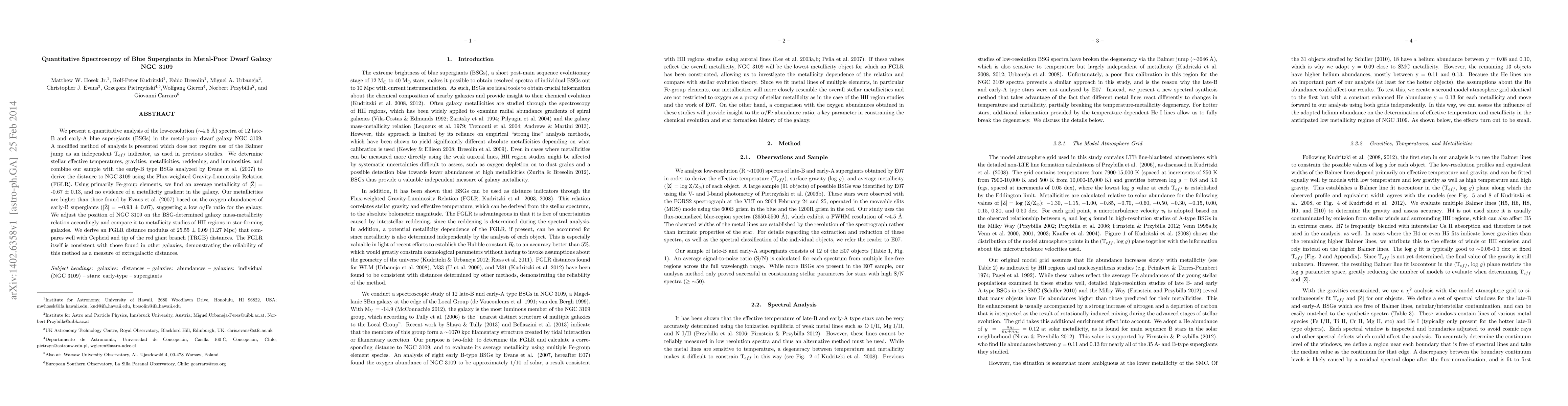 This paper analyzes the spectra of blue supergiants in NGC 3109, determining effective temperatures, gravities, metallicities, and luminosities without relying on the Balmer jump. The study finds an average metallicity of [Z] = -0.67 +/- 0.13, higher than previous estimates, and derives a distance to NGC 3109 of 1.27 Mpc using the FGLR, consistent with other distance measures.
