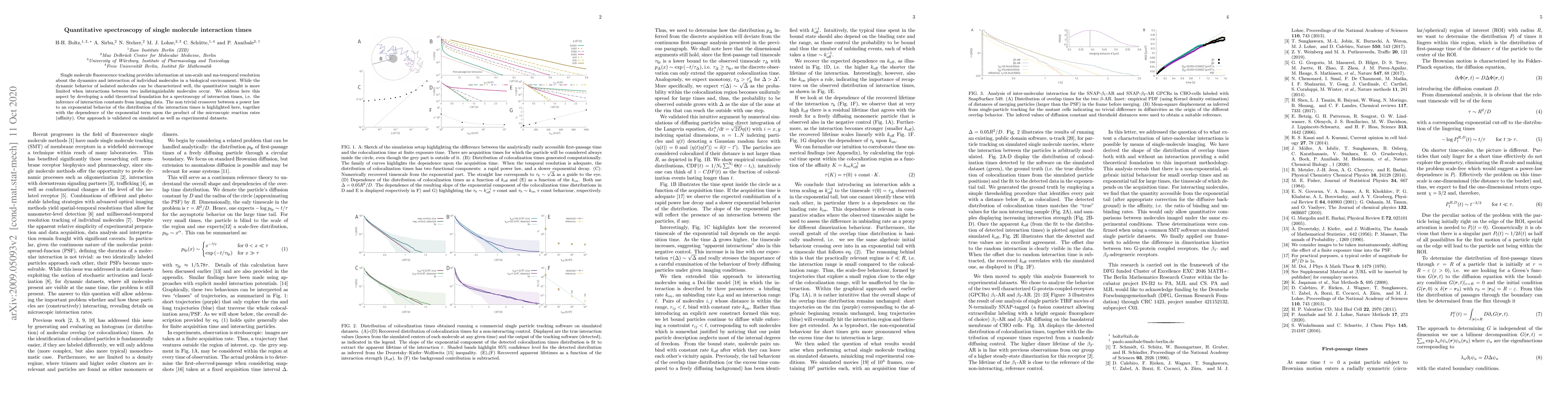Single molecule fluorescence tracking provides information at nm-scale and ms-temporal resolution about the dynamics and interaction of individual molecules in a biological environment. While the dynamic behavior of isolated molecules can be characterized well, the quantitative insight is more limited when interactions between two indistinguishable molecules occur. We address here this aspect by developing a solid theoretical foundation for a spectroscopy of interaction times, i.e. the inference of interaction constants from imaging data. The non trivial crossover between a power law to an exponential behavior of the distribution of the interaction times is highlighted here, together with the dependence of the exponential term upon the product of the microscopic reaction rates (affinity). Our approach is validated on simulated as well as experimental datasets.
