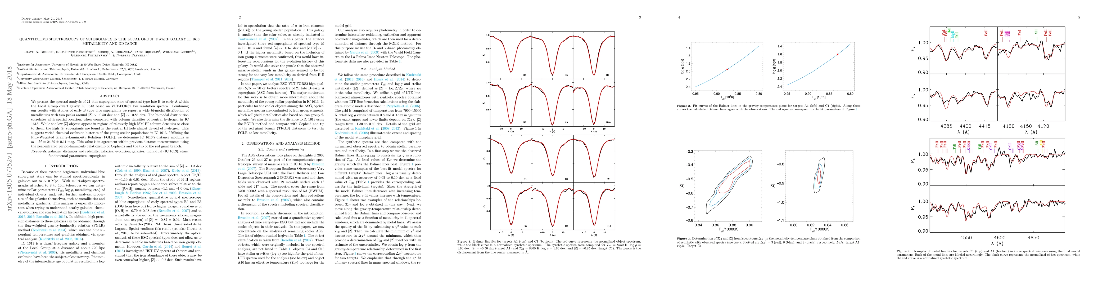 This paper analyzes the spectral properties of 21 blue supergiant stars in the Local Group dwarf galaxy IC 1613, revealing a bi-modal metallicity distribution correlated with the galaxy's neutral hydrogen column densities. The study determines IC 1613's distance modulus as $m - M$ = 24.39 $\pm$ 0.11 mag, consistent with previous measurements.