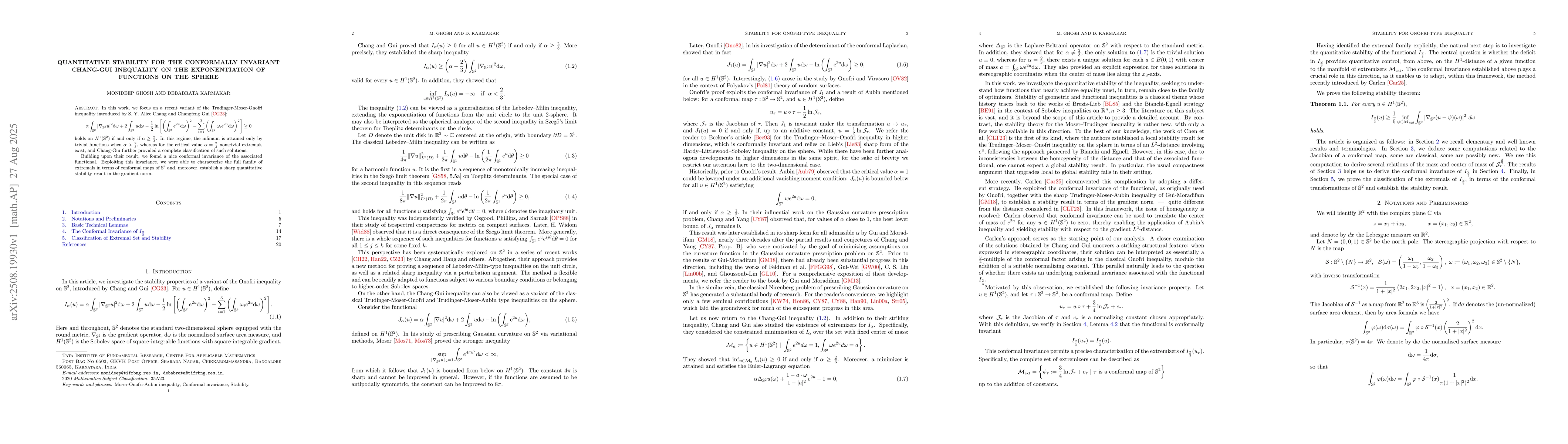 In this work, we focus on a recent variant of the Trudinger-Moser-Onofri inequality introduced by S. Y. Alice Chang and Changfeng Gui \cite{CG-2023}: \begin{align*} \alpha\int_{\mathbb{S}^2}|\nabla_{\mathbb{S}^2}u|^2 {\rm d}\omega+2 \int_{\mathbb{S}^2} u {\rm d}\omega -\frac{1}{2}\ln\left[\left(\int_{\mathbb{s}^2}e^{2u}{\rm d}\omega\right)^2-\sum_{i=1}^3\left(\int_{\mathbb{s}^2}\omega_i e^{2u}{\rm d} \omega\right)^2\right] \geq 0 \end{align*} holds on $H^1(\mathbb{S}^2)$ if and only if $\alpha \geq \frac{2}{3}$. In this regime, the infimum is attained only by trivial functions when $\alpha > \frac{2}{3},$ whereas for the critical value $\alpha = \frac{2}{3}$ nontrivial extremals exist, and Chang-Gui further provided a complete classification of such solutions. Building upon their result, we found a nice conformal invariance of the associated functional. Exploiting this invariance, we were able to characterize the full family of extremals in terms of conformal maps of $\mathbb{S}^2$ and, moreover, establish a sharp quantitative stability result in the gradient norm.