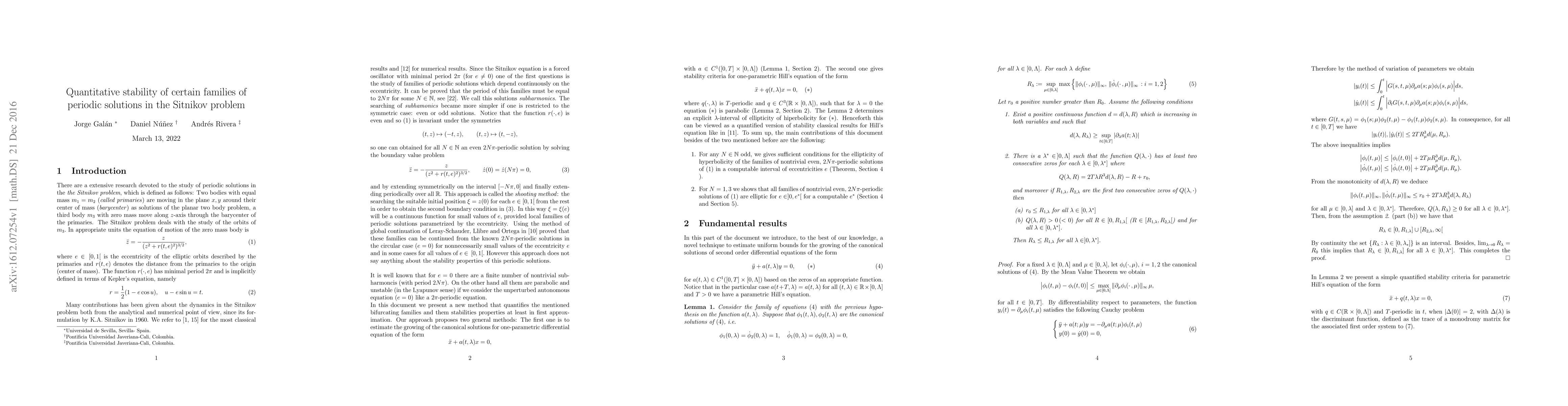 The Sitnikov problem is a special case of the restricted three-body problem where the primaries moves in elliptic orbits of the two-body problem with eccentricity $e\in [0,1[$ and the massless body moves on a straight line perpendicular to the plane of motion of the primaries through their barycenter. It is well known that for the circular case ($e=0$) and a given $N\in \mathbb{N}$ there are a finite number of nontrivial symmetric $2N\pi$ periodic solutions all of them parabolic and unstable (in the Lyapunov sense) if we consider the corresponding autonomous equation like a $2\pi$-periodic equation. Using the method of global continuation of Leray-Schauder, J.Llibre and R.Ortega (J.Llibre $\&$ R. Ortega, 2008) proved that these families of periodic solutions can be continued from the known $2N\pi$-periodic solutions in the circular case for nonnecessarily small values of the eccentricity $e$ and in some cases for all values of $e\in \, [0,1[.$ However this approach does not say anything about the stability properties of this periodic solutions. In this document we present a new method that quantifies the mentioned bifurcating families and them stabilities properties at least in first approximation. Our approach proposes two general methods: The first one is to estimate the growing of the canonical solutions for one-parametric differential equation of the form \[ \ddot{x}+a(t,\lambda)x=0, \] with $a\in C^{1}([0,T] \times [0,\Lambda])$. The second one gives stability criteria for one-parametric Hill's equation of the form \[ \ddot{x}+q(t,\lambda)x=0, \quad (\ast) \] where $q(\cdot,\lambda)$ is $T$-periodic and $q\in C^{3}(\mathbb{R}\times [0,\Lambda])$, such that for $\lambda=0$ the equation $(*)$ is parabolic.