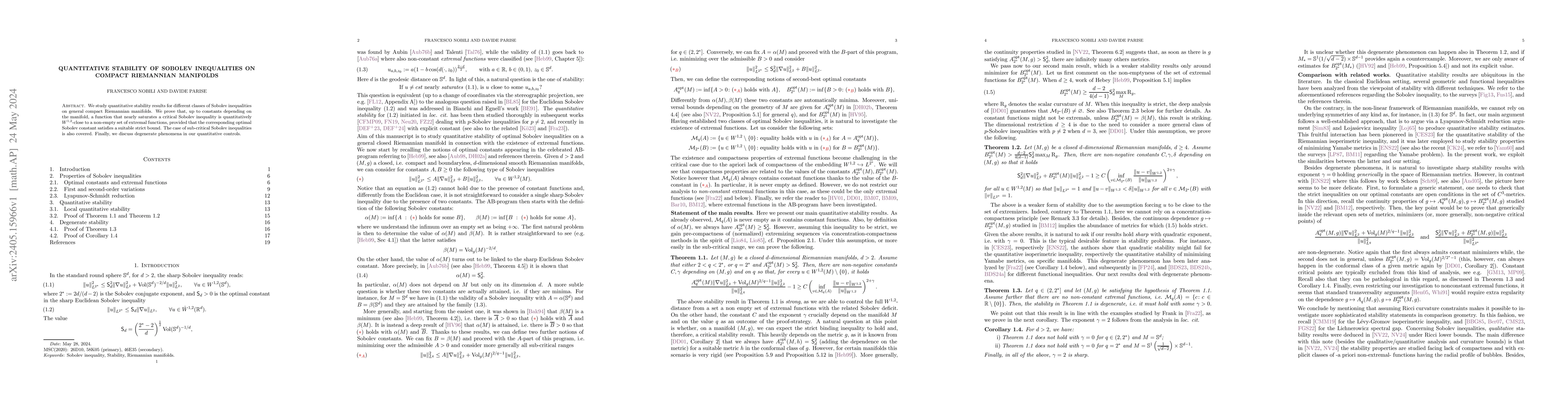This research investigates quantitative stability for various Sobolev inequalities on compact Riemannian manifolds, proving that functions nearly achieving critical Sobolev bounds are closely related to extremal functions, contingent on a strict bound on the optimal Sobolev constant. It also examines sub-critical cases and highlights degenerate behaviors in the stability measures.
