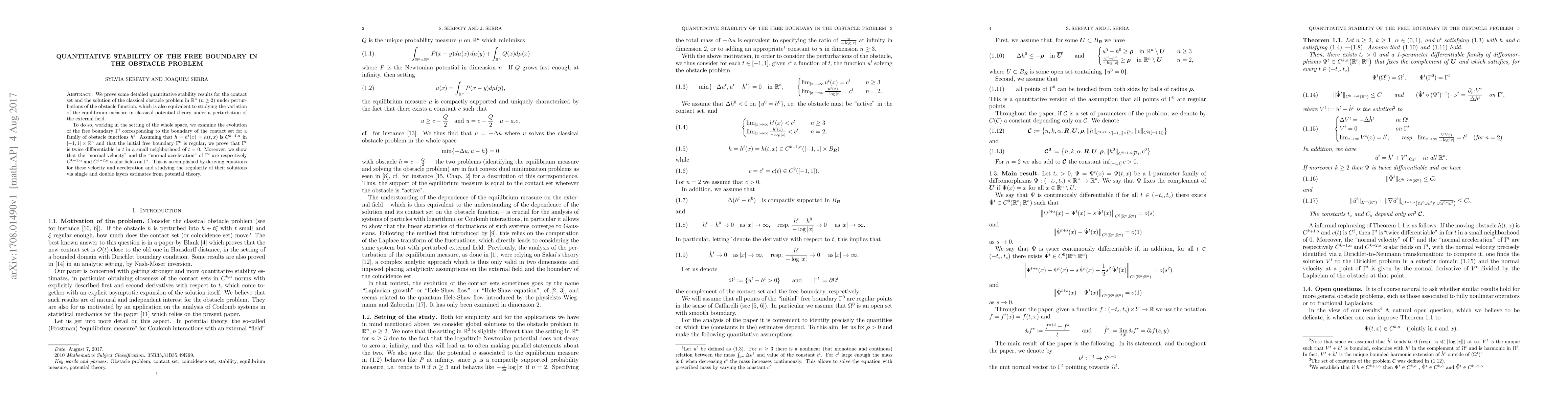 We prove some detailed quantitative stability results for the contact set and the solution of the classical obstacle problem in $\mathbb{R}^n$ ($n \ge 2$) under perturbations of the obstacle function, which is also equivalent to studying the variation of the equilibrium measure in classical potential theory under a perturbation of the external field. To do so, working in the setting of the whole space, we examine the evolution of the free boundary $\Gamma^t$ corresponding to the boundary of the contact set for a family of obstacle functions $h^t$. Assuming that $h=h^t (x) = h(t,x)$ is $C^{k+1,\alpha}$ in $[-1,1]\times \mathbb{R}^n$ and that the initial free boundary $\Gamma^0$ is regular, we prove that $\Gamma^t$ is twice differentiable in $t$ in a small neighborhood of $t=0$. Moreover, we show that the "normal velocity" and the "normal acceleration" of $\Gamma^t$ are respectively $C^{k-1,\alpha}$ and $C^{k-2,\alpha}$ scalar fields on $\Gamma^t$. This is accomplished by deriving equations for these velocity and acceleration and studying the regularity of their solutions via single and double layers estimates from potential theory.