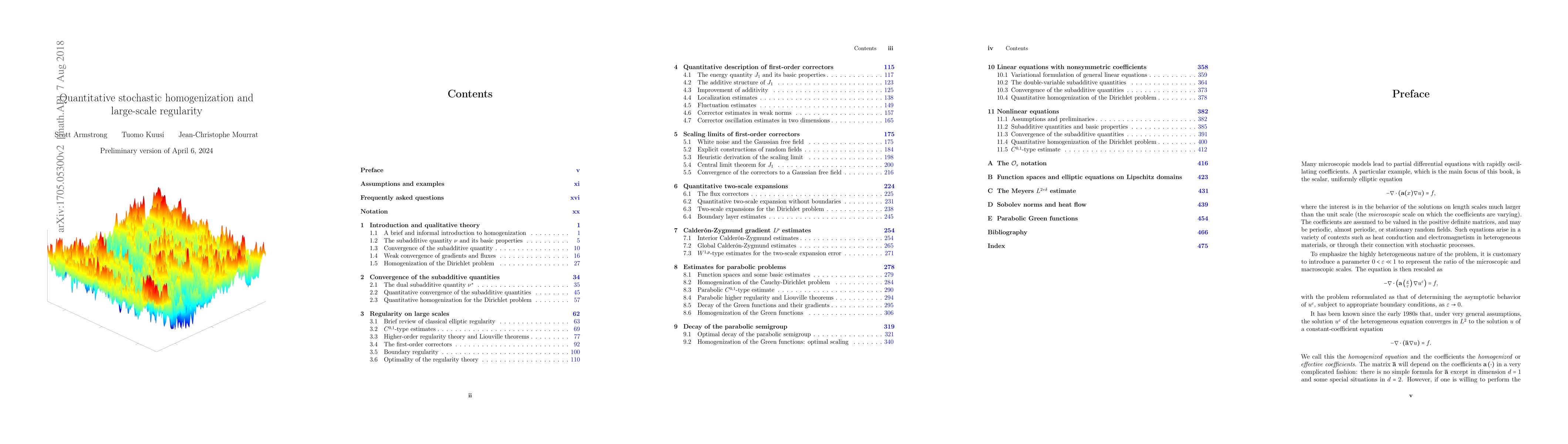 This is a preliminary version of a book which presents the quantitative homogenization and large-scale regularity theory for elliptic equations in divergence-form. The self-contained presentation gives new and simplified proofs of the core results proved in the last several years, including the algebraic convergence rate for the variational subadditive quantities, the large-scale Lipschitz and higher regularity estimates and Liouville-type results, optimal quantitative estimates on the first-order correctors and their scaling limit to a Gaussian free field. There are several chapters containing new results, such as: quantitative estimates for the Dirichlet problem, including optimal quantitative estimates of the homogenization error and the two-scale expansion; optimal estimates for the homogenization of the parabolic and elliptic Green functions; and $W^{1,p}$-type estimates for two-scale expansions.