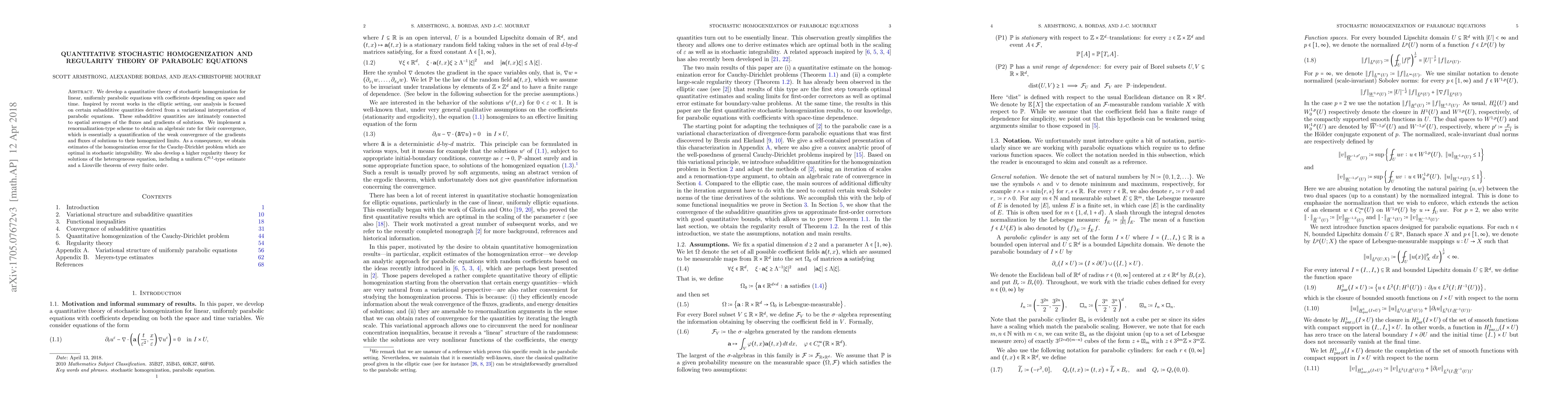 This paper develops a quantitative stochastic homogenization theory for linear, uniformly parabolic equations with space-time dependent coefficients, focusing on subadditive quantities linked to solution fluxes and gradients. The authors achieve an algebraic convergence rate and obtain optimal stochastic integrability error estimates for the Cauchy-Dirichlet problem, along with higher regularity results for solutions.