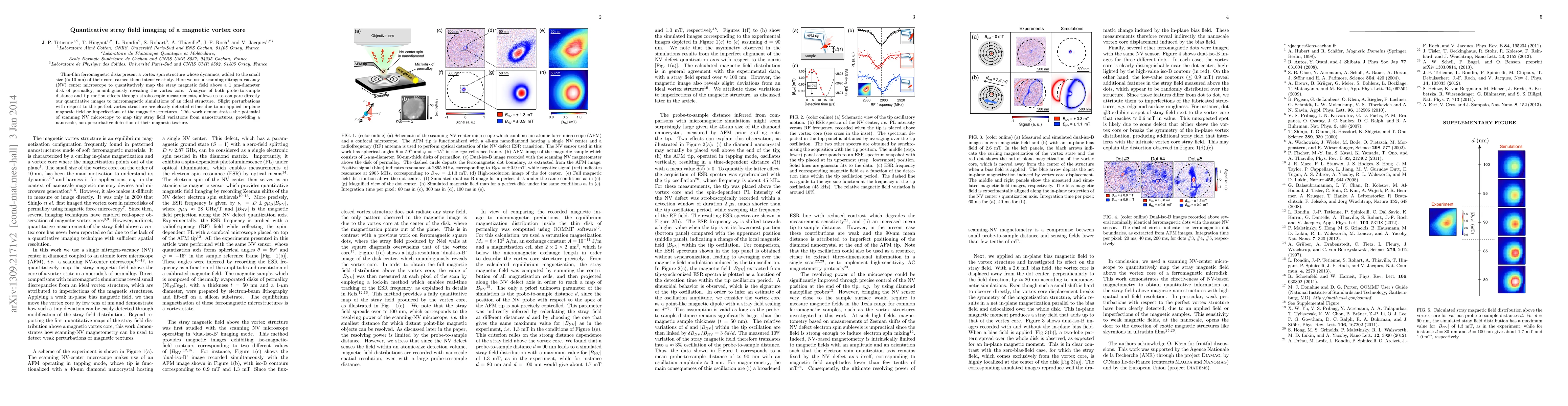 This paper employs scanning nitrogen-vacancy center microscopy to quantitatively map the stray magnetic field of a permalloy vortex core, revealing subtle perturbations due to external fields or structural imperfections. The study validates the technique's potential for nanoscale magnetic field detection and comparison with micromagnetic simulations.