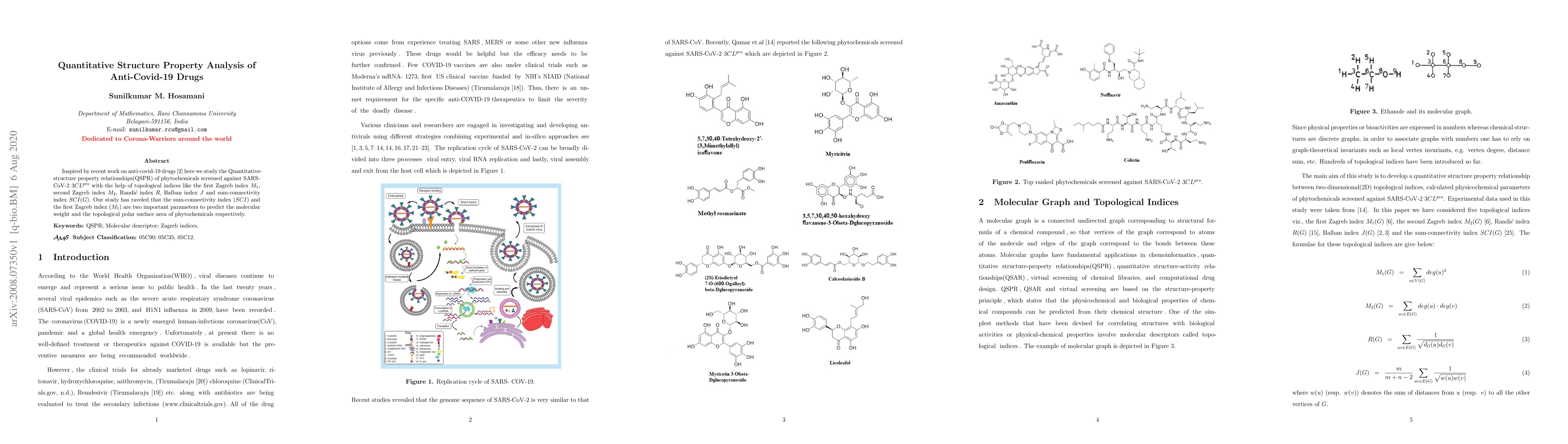 Inspired by recent work on anti-covid-19 drugs \cite{2} here we study the Quantitative-structure property relationships(QSPR) of phytochemicals screened against SARS-CoV-2 $3CL^{pro}$ with the help of topological indices like the first Zagreb index $M_{1}$, second Zagreb index $M_{2}$, Randi$\acute{c}$ index $R$, Balban index $J$ and sum-connectivity index $SCI(G)$. Our study has raveled that the sum-connectivity index $(SCI)$ and the first Zagreb index $(M_{1})$ are two important parameters to predict the molecular weight and the topological polar surface area of phytochemicals respectively.