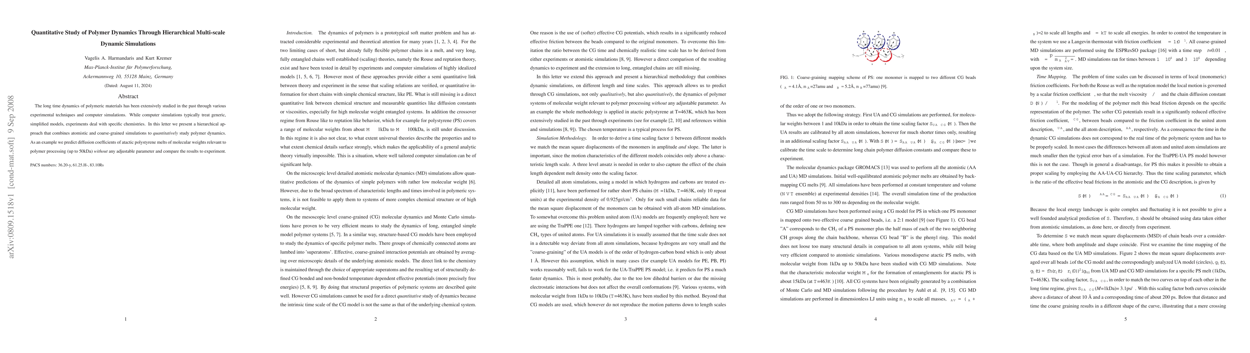 This paper proposes a hierarchical multi-scale dynamic simulation approach combining atomistic and coarse-grained models to quantitatively study polymer dynamics. The method accurately predicts diffusion coefficients of atactic polystyrene melts without adjustable parameters, demonstrating its potential for polymer processing applications.