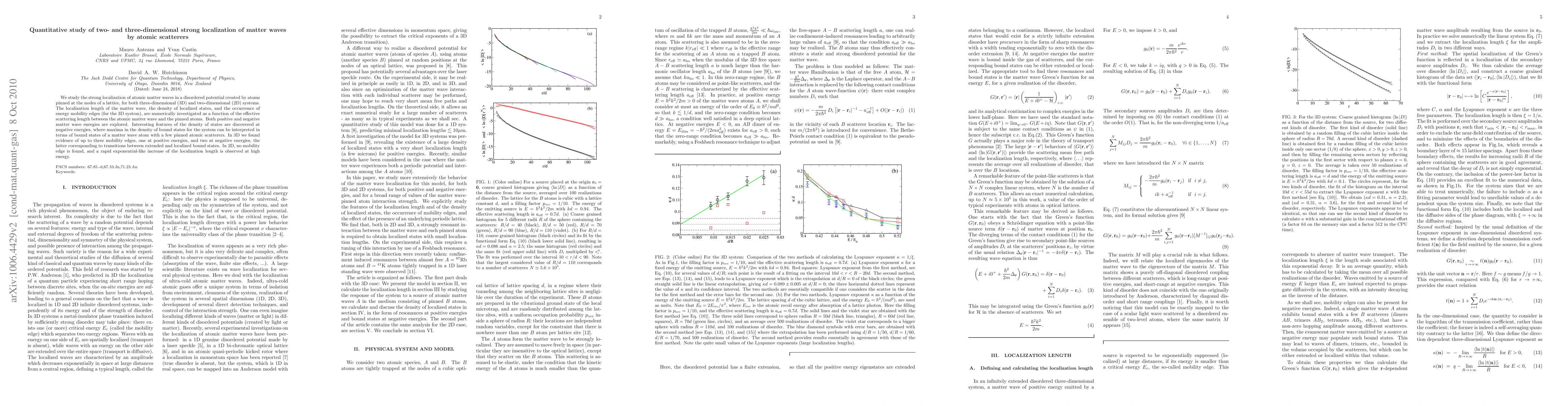 This paper investigates the strong localization of matter waves in disordered atomic potentials, exploring both 2D and 3D systems. It finds distinct features in the density of states, including multiple mobility edges in 3D and a rapid increase in localization length at high energy in 2D.