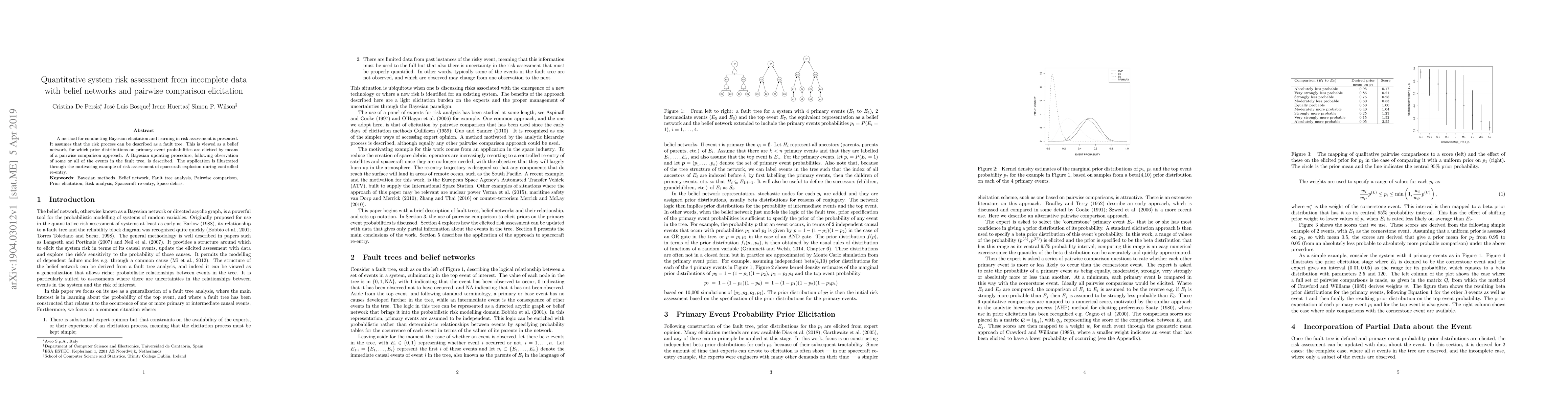 This paper proposes a method for Bayesian risk assessment using belief networks and pairwise comparison elicitation to handle incomplete data. It demonstrates Bayesian updating in fault tree analysis, illustrated by assessing spacecraft explosion risk during re-entry.
