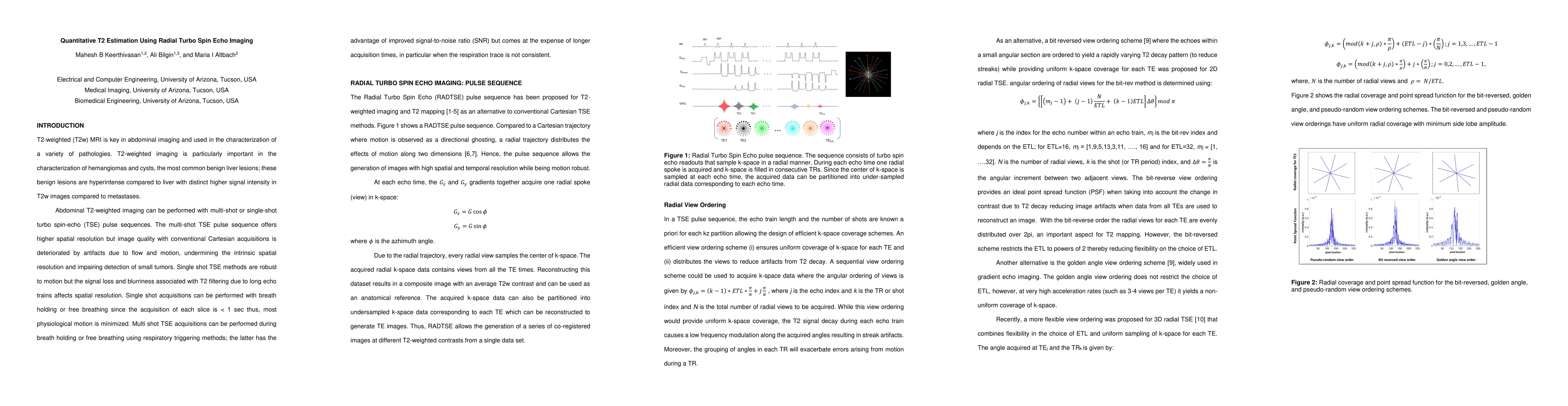 This paper introduces a RADTSE technique for efficient quantitative T2 estimation in abdominal imaging, utilizing a single undersampled acquisition to generate accurate T2 maps, and discusses the pulse sequence design and reconstruction algorithms, supported by phantom and in vivo imaging results.