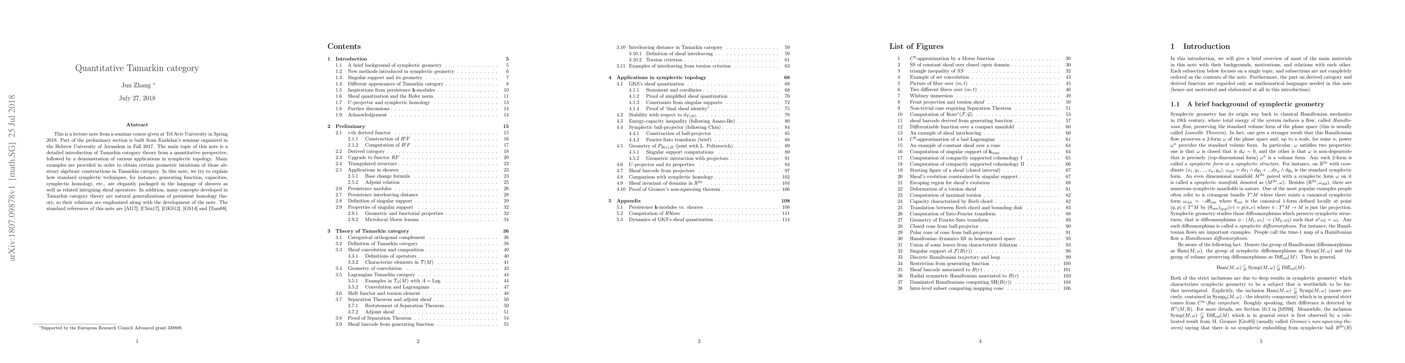 This is a lecture note from a seminar course given at Tel Aviv University in Spring 2018. Part of the preliminary section is built from Kazhdan's seminar organized in the Hebrew University of Jerusalem in Fall 2017. The main topic of this note is a detailed introduction of Tamarkin category theory from a quantitative perspective, followed by a demonstration of various applications in symplectic topology. Many examples are provided in order to obtain certain geometric intuitions of those abstract algebraic constructions in Tamarkin category. In this note, we try to explain how standard symplectic techniques, for instance, generating function, capacities, symplectic homology, etc., are elegantly packaged in the language of sheaves as well as related intriguing sheaf operators. In addition, many concepts developed in Tamarkin category theory are natural generalizations of persistent homology theory, so their relations are emphasized along with the development of the note.