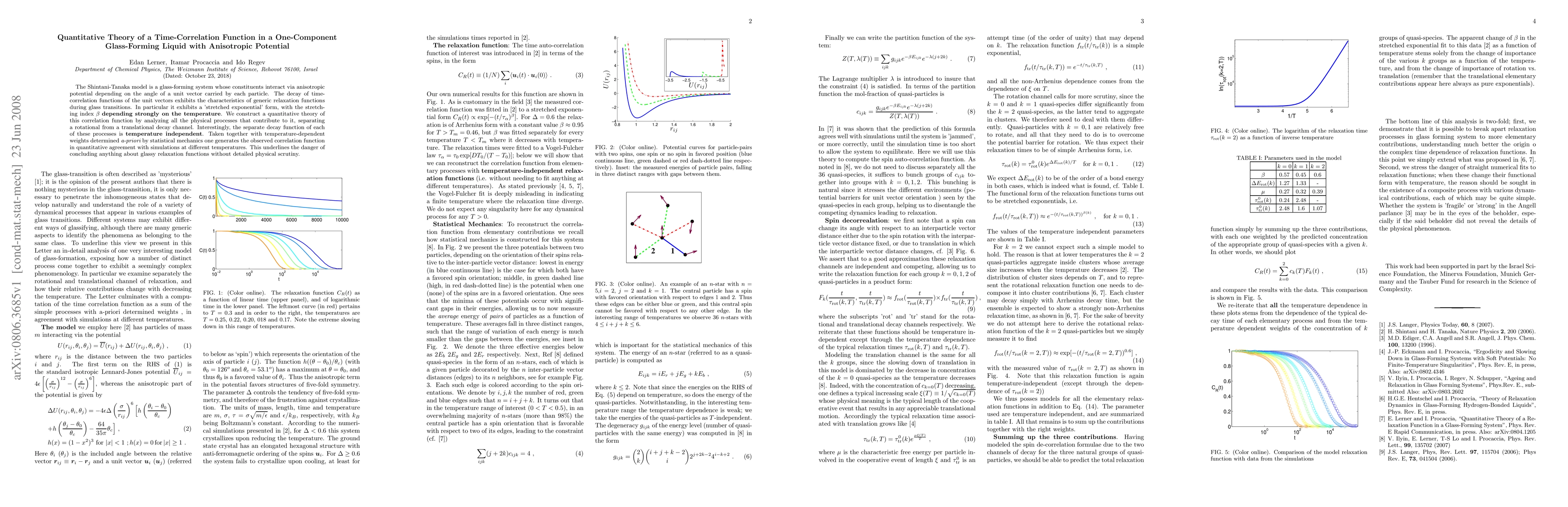 The Shintani-Tanaka model is a glass-forming system whose constituents interact via anisotropic potential depending on the angle of a unit vector carried by each particle. The decay of time-correlation functions of the unit vectors exhibits the characteristics of generic relaxation functions during glass transitions. In particular it exhibits a 'stretched exponential' form, with the stretching index beta depending strongly on the temperature. We construct a quantitative theory of this correlation function by analyzing all the physical processes that contribute to it, separating a rotational from a translational decay channel. Interestingly, the separate decay function of each of these processes is temperature independent. Taken together with temperature-dependent weights determined a-priori by statistical mechanics one generates the observed correlation function in quantitative agreement with simulations at different temperatures. This underlines the danger of concluding anything about glassy relaxation functions without detailed physical scrutiny.