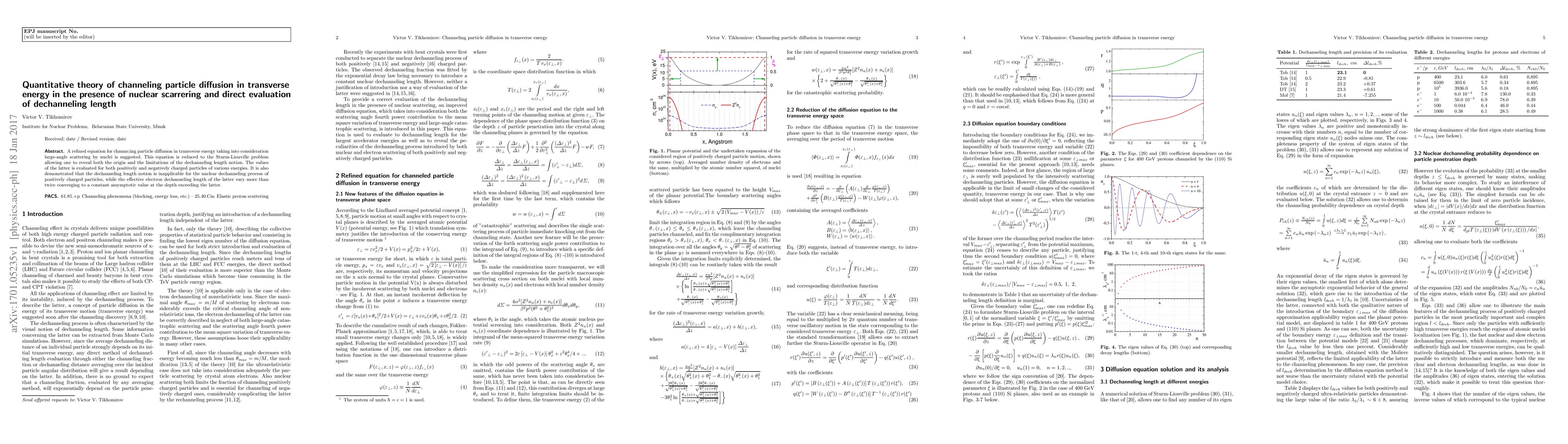 This paper proposes a refined equation for channeling particle diffusion in transverse energy, considering large-angle nuclear scattering. It evaluates dechanneling lengths for positively and negatively charged particles, showing that the concept does not apply to nuclear dechanneling for positive charges, while the effective electron dechanneling length for positive particles converges to a constant value at greater depths.