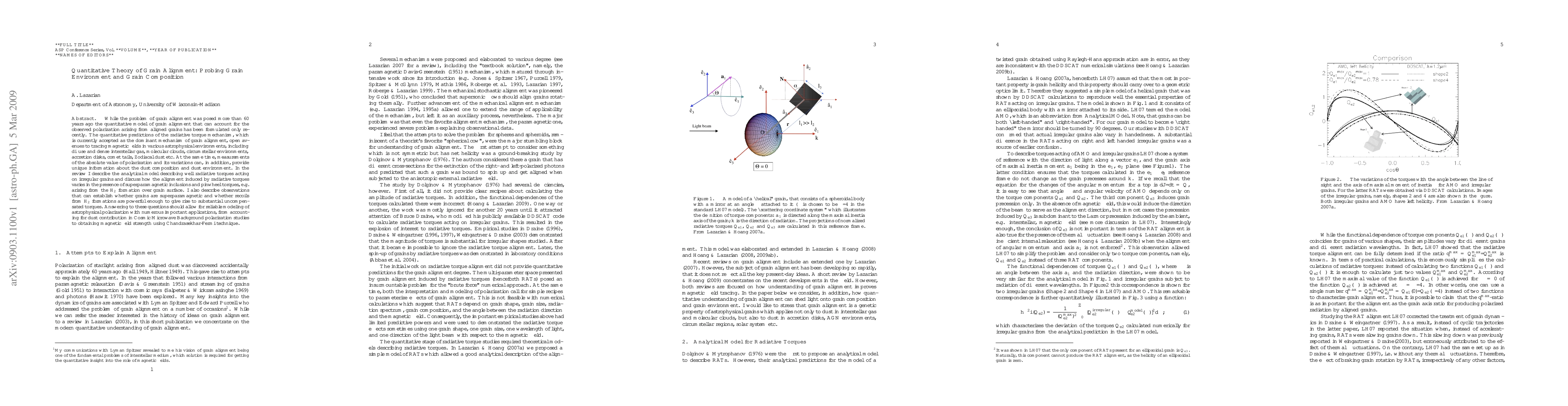 While the problem of grain alignment was posed more than 60 years ago the quantitative model of grain alignment that can account for the observed polarization arising from aligned grains has been formulated only recently. The quantitative predictions of the radiative torque mechanism, which is currently accepted as the dominant mechanism of grain alignment, open avenues to tracing magnetic fields in various astrophysical environments, including diffuse and dense interstellar gas, molecular clouds, circumstellar environments, accretion disks, comet tails, Zodiacal dust etc. At the same time, measurements of the absolute value of polarization and its variations can, in addition, provide unique information about the dust composition and dust environment. In the review I describe the analytical model describing well radiative torques acting on irregular grains and discuss how the alignment induced by radiative torques varies in the presence of superparamagnetic inclusions and pinwheel torques, e.g. arising from the molecular hydrogen formation over grain surface. I also describe observations that can establish whether grains are superparamagnetic and whether recoils from molecular hydrogen formations are powerful enough to give rise to substantial uncompensated torques. Answering to these questions should allow for reliable modeling of astrophysical polarization with numerous important applications, from accounting for dust contribution in Cosmic Microwave Background polarization studies to obtaining magnetic field strength using Chandrasekhar-Fermi technique.