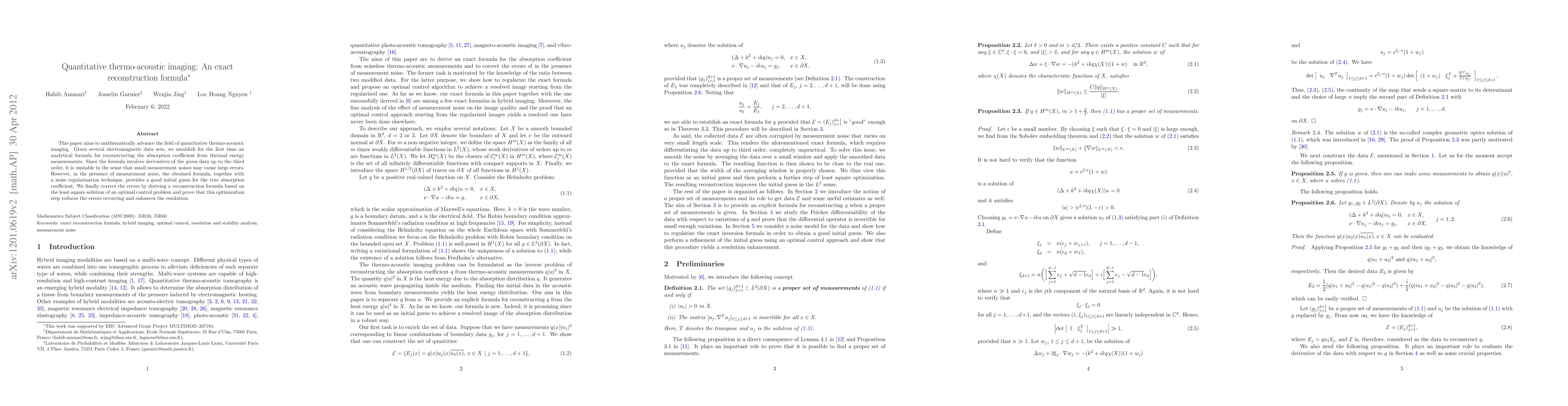 This paper aims to mathematically advance the field of quantitative thermo-acoustic imaging. Given several electromagnetic data sets, we establish for the first time an analytical formula for reconstructing the absorption coefficient from thermal energy measurements. Since the formula involves derivatives of the given data up to the third order, it is unstable in the sense that small measurement noises may cause large errors. However, in the presence of measurement noise, the obtained formula, together with a noise regularization technique, provides a good initial guess for the true absorption coefficient. We finally correct the errors by deriving a reconstruction formula based on the least square solution of an optimal control problem and prove that this optimization step reduces the errors occurring and enhances the resolution.