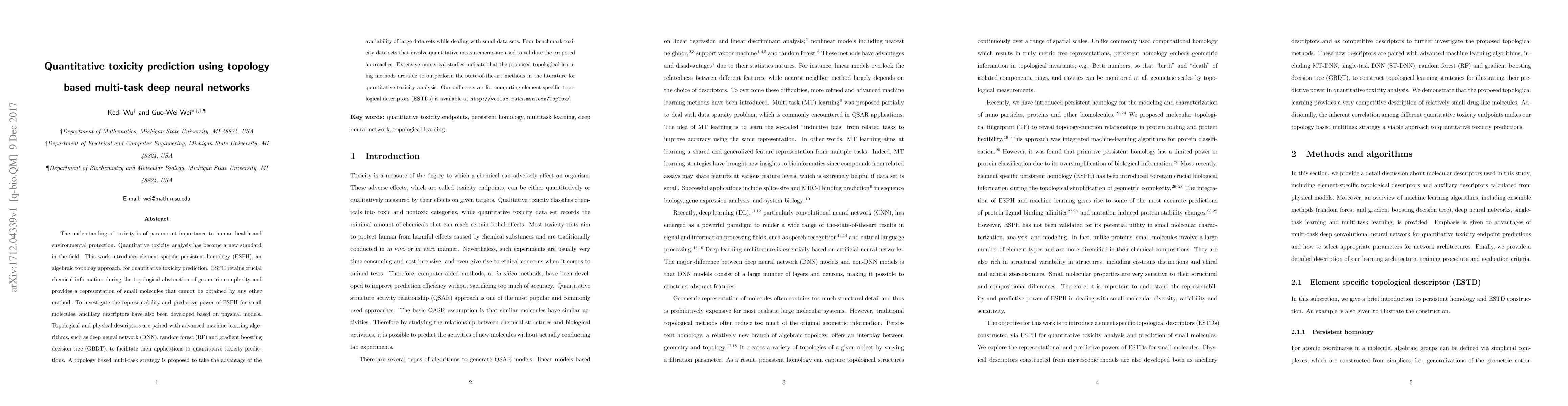 This research introduces element-specific persistent homology (ESPH), a topology-based method, for predicting toxicity of small molecules. ESPH, combined with machine learning algorithms like DNN, RF, and GBDT, outperforms existing methods in quantitative toxicity analysis, as demonstrated through extensive numerical studies using benchmark datasets. An online server for computing ESTDs is provided.