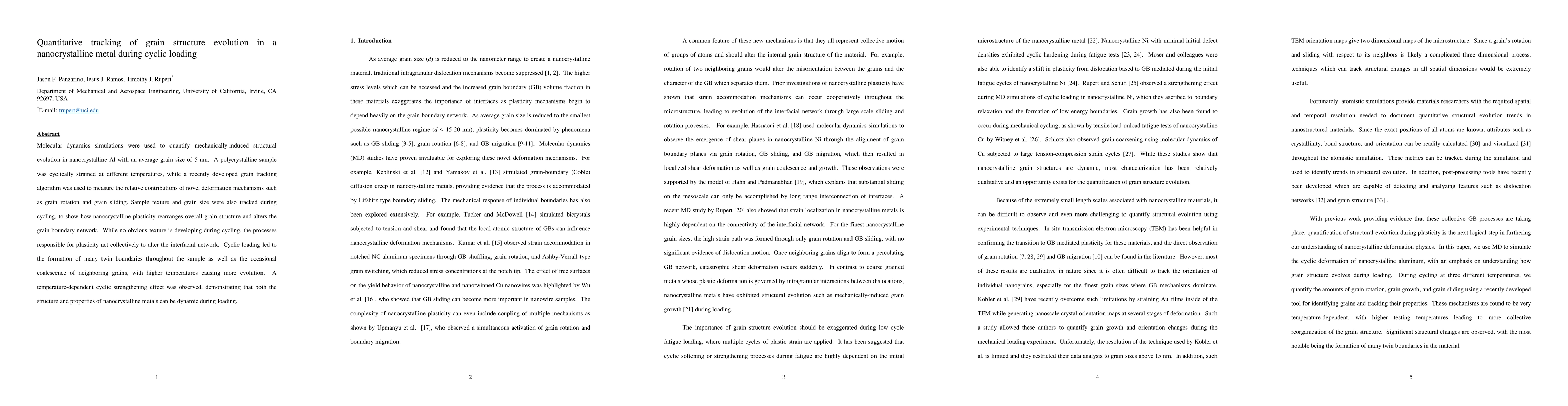 This study uses molecular dynamics simulations to track the evolution of grain structure in nanocrystalline aluminum under cyclic loading, revealing significant grain rotation, sliding, and the formation of twin boundaries. Higher temperatures induce more structural changes, demonstrating a dynamic response in nanocrystalline metals' mechanical properties.