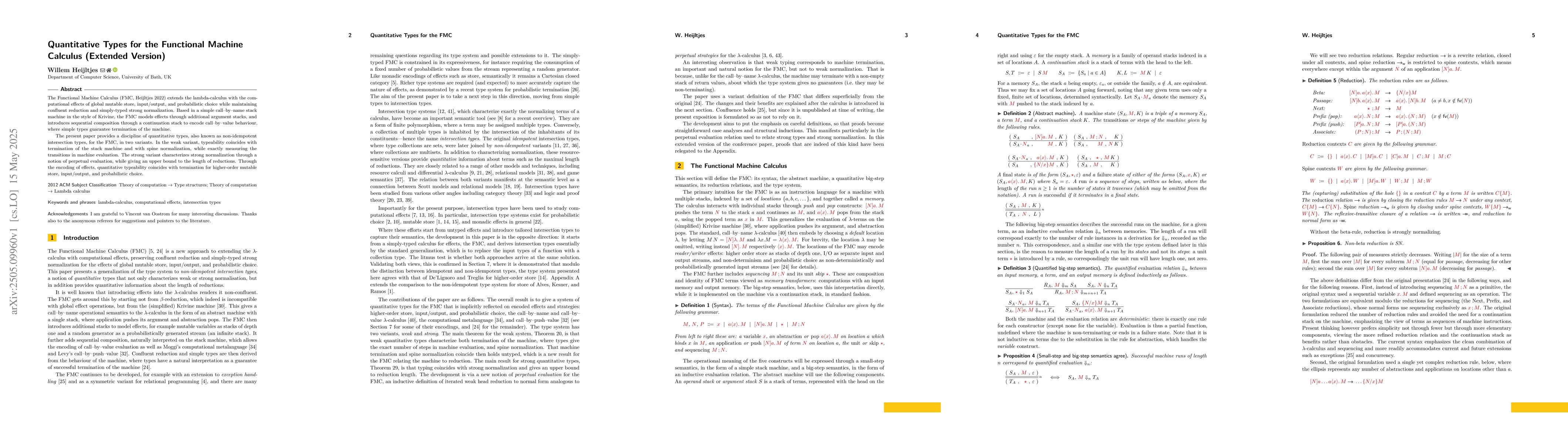 The Functional Machine Calculus (FMC, Heijltjes 2022) extends the lambda-calculus with the computational effects of global mutable store, input/output, and probabilistic choice while maintaining confluent reduction and simply-typed strong normalization. Based in a simple call-by-name stack machine in the style of Krivine, the FMC models effects through additional argument stacks, and introduces sequential composition through a continuation stack to encode call-by-value behaviour, where simple types guarantee termination of the machine. The present paper provides a discipline of quantitative types, also known as non-idempotent intersection types, for the FMC, in two variants. In the weak variant, typeability coincides with termination of the stack machine and with spine normalization, while exactly measuring the transitions in machine evaluation. The strong variant characterizes strong normalization through a notion of perpetual evaluation, while giving an upper bound to the length of reductions. Through the encoding of effects, quantitative typeability coincides with termination for higher-order mutable store, input/output, and probabilistic choice.