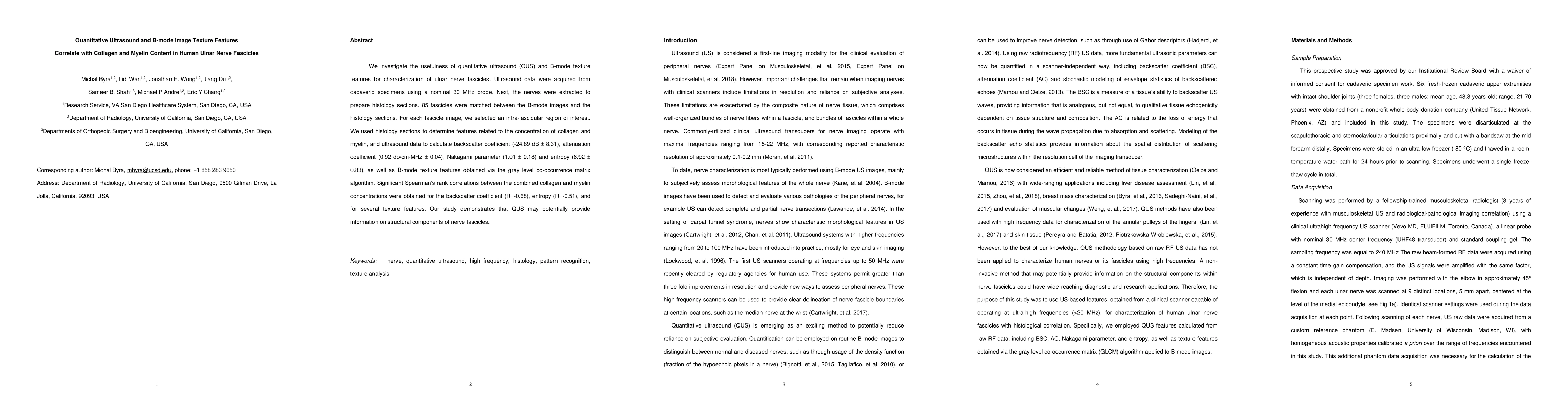 Quantitative ultrasound features correlated with collagen and myelin content in human ulnar nerve fascicles, suggesting a potential application for non-invasive diagnosis or monitoring of nerve damage.