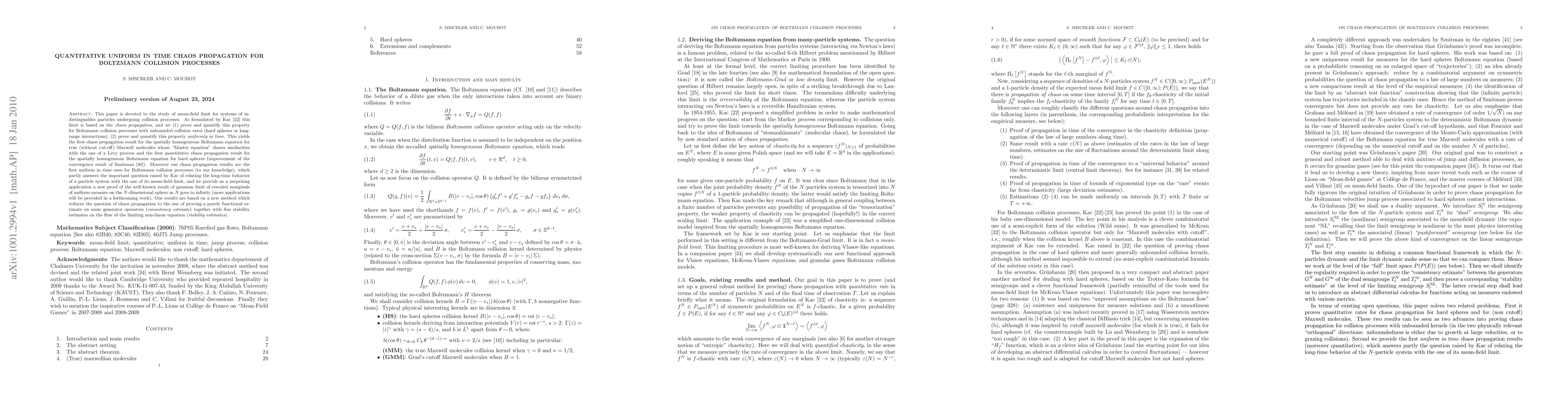 This paper is devoted to the study of mean-field limit for systems of indistinguables particles undergoing collision processes. As formulated by Kac \cite{Kac1956} this limit is based on the {\em chaos propagation}, and we (1) prove and quantify this property for Boltzmann collision processes with unbounded collision rates (hard spheres or long-range interactions), (2) prove and quantify this property \emph{uniformly in time}. This yields the first chaos propagation result for the spatially homogeneous Boltzmann equation for true (without cut-off) Maxwell molecules whose "Master equation" shares similarities with the one of a L\'evy process and the first {\em quantitative} chaos propagation result for the spatially homogeneous Boltzmann equation for hard spheres (improvement of the %non-contructive convergence result of Sznitman \cite{S1}). Moreover our chaos propagation results are the first uniform in time ones for Boltzmann collision processes (to our knowledge), which partly answers the important question raised by Kac of relating the long-time behavior of a particle system with the one of its mean-field limit, and we provide as a surprising application a new proof of the well-known result of gaussian limit of rescaled marginals of uniform measure on the $N$-dimensional sphere as $N$ goes to infinity (more applications will be provided in a forthcoming work). Our results are based on a new method which reduces the question of chaos propagation to the one of proving a purely functional estimate on some generator operators ({\em consistency estimate}) together with fine stability estimates on the flow of the limiting non-linear equation ({\em stability estimates}).