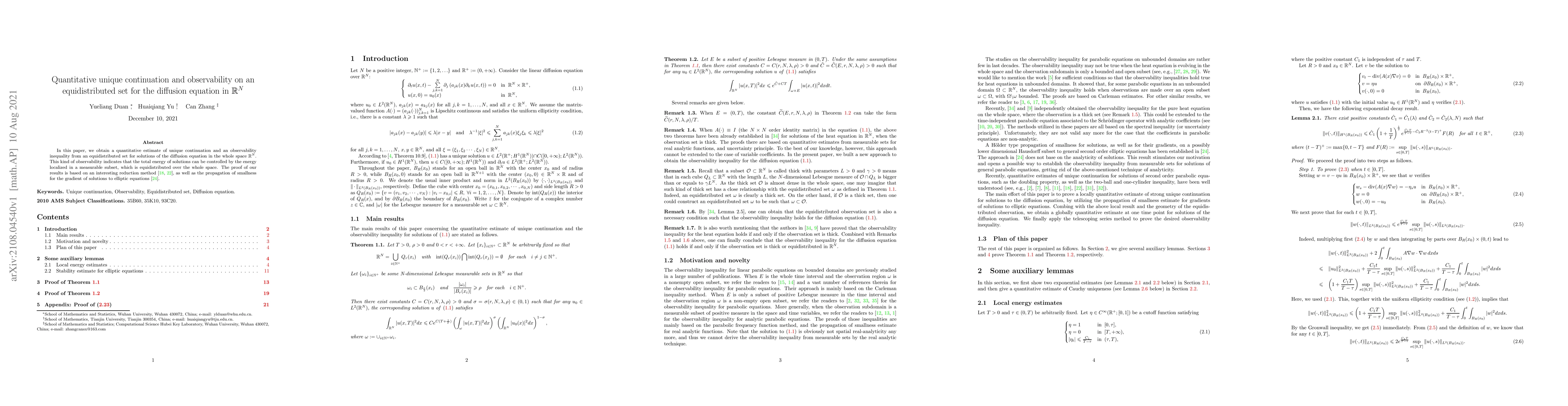 In this paper, we obtain a quantitative estimate of unique continuation and an observability inequality from an equidistributed set for solutions of the diffusion equation in the whole space RN. This kind of observability indicates that the total energy of solutions can be controlled by the energy localized in a measurable subset, which is equidistributed over the whole space. The proof of our results is based on an interesting reduction method [18, 22], as well as the propagation of smallness for the gradient of solutions to elliptic equations [24].
