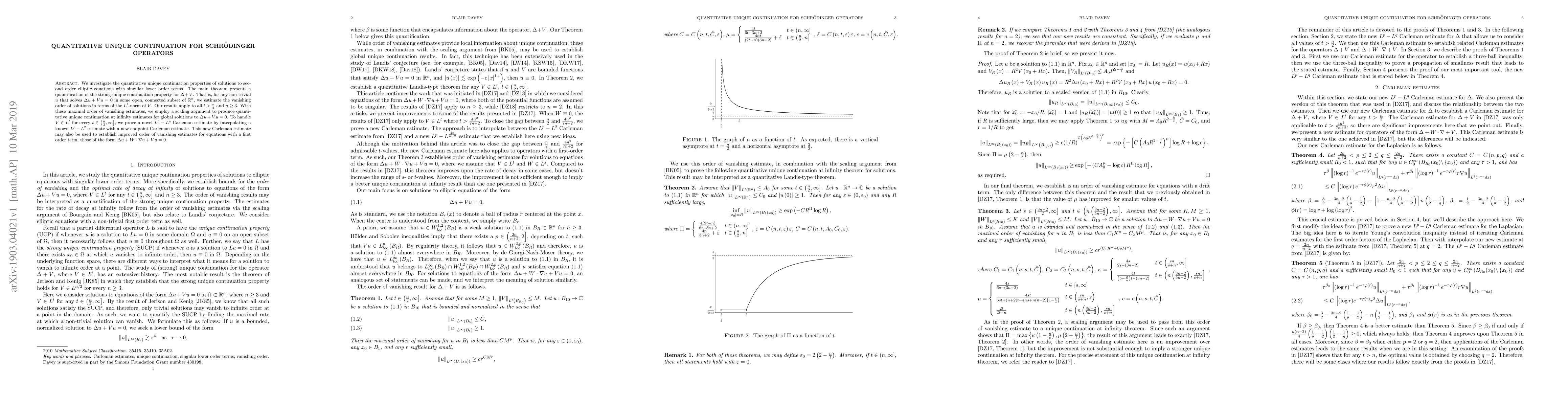 This paper quantifies the unique continuation properties of solutions to the Schrödinger operator $\Delta + V$ with singular lower order terms, providing estimates for the vanishing order of solutions in terms of the $L^t$-norm of $V$. It introduces a novel $L^p - L^q$ Carleman estimate to handle $V \in L^t$ for $t > \frac{n}{2}$ and $n \ge 3$, and applies these results to establish quantitative unique continuation at infinity.
