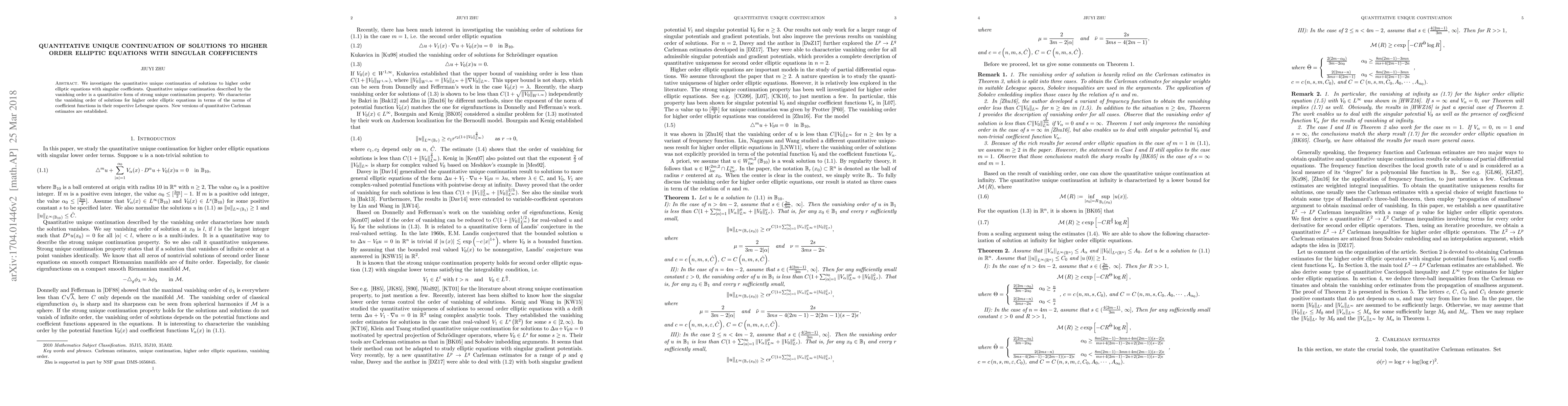 This research explores the quantitative unique continuation property for solutions to higher order elliptic equations with singular coefficients, characterizing the vanishing order through the norms of coefficient functions in Lebesgue spaces, and introducing new quantitative Carleman estimates.
