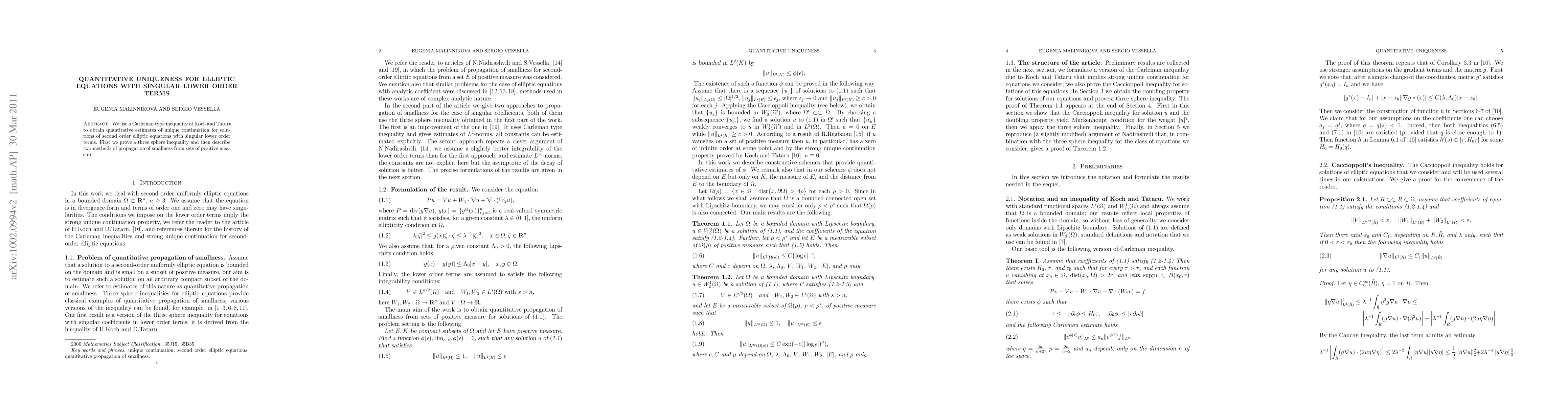 Summary: This research leverages a Carleman inequality to derive quantitative unique continuation estimates for solutions of elliptic equations with singular lower order terms. It establishes a three sphere inequality and employs two methods to propagate smallness from sets of positive measure.