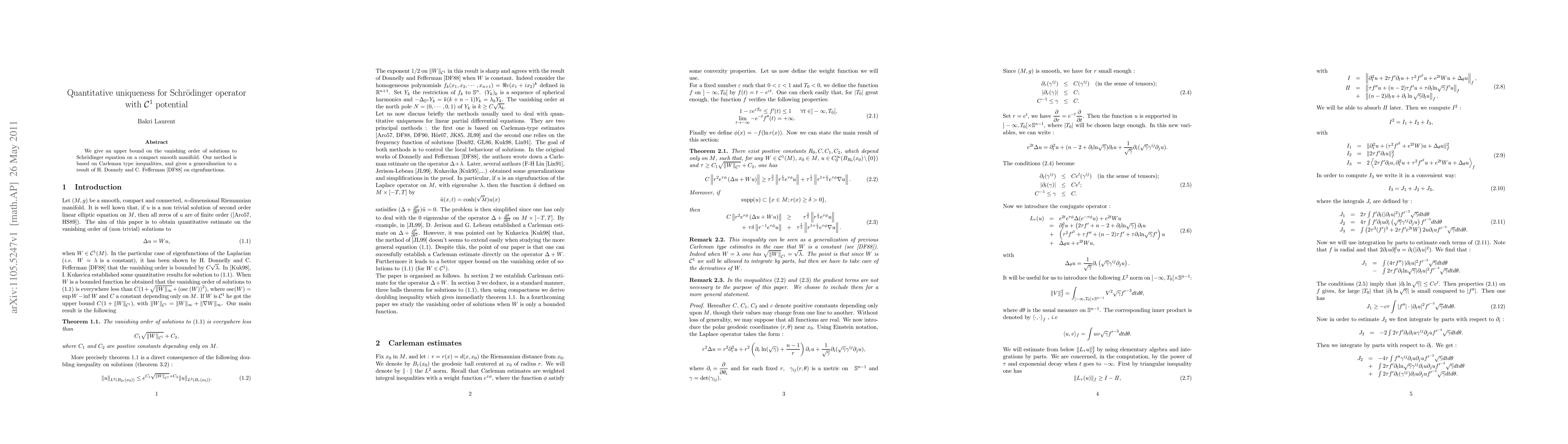 We give a sharp upper bound on the vanishing order of solutions to Schr\"odinger equation, in the case that the potential is of class $\mathcal{C}^1$ on a smooth compact manifold.