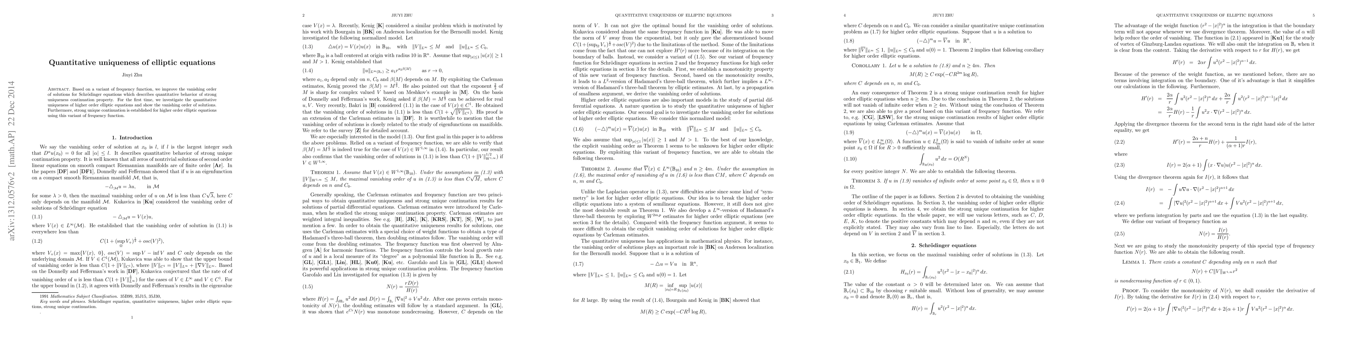 This paper enhances the vanishing order of solutions for Schrödinger equations through a novel frequency function, establishing quantitative uniqueness for higher-order elliptic equations and proving strong unique continuation properties for these equations.