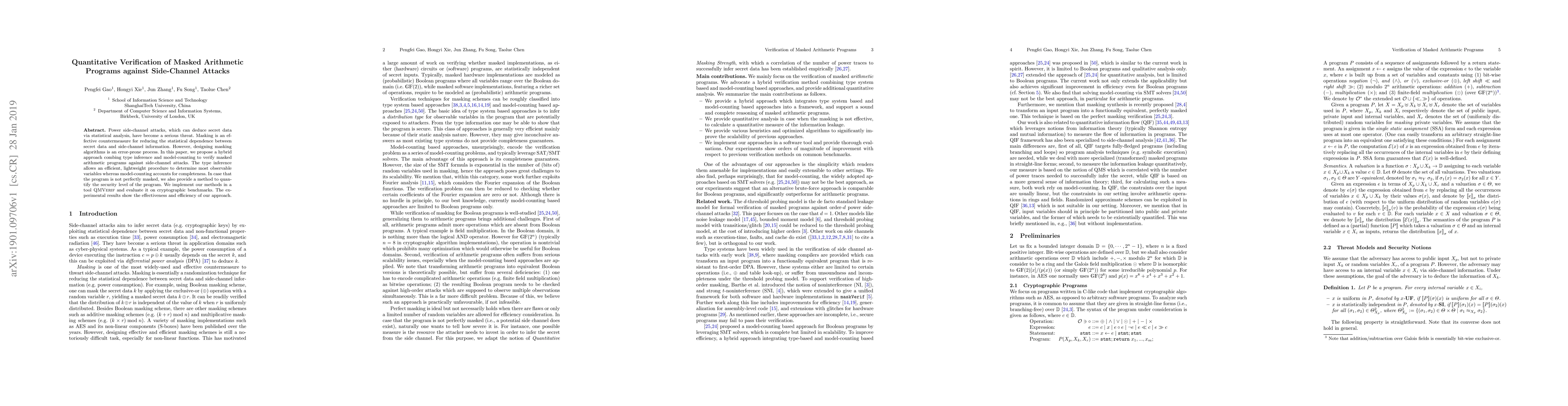 This paper proposes a hybrid verification method combining type inference and model-counting to assess the effectiveness of masked arithmetic programs against side-channel attacks. The tool QMVerif evaluates cryptographic benchmarks, demonstrating the approach's effectiveness and efficiency in quantifying program security levels.