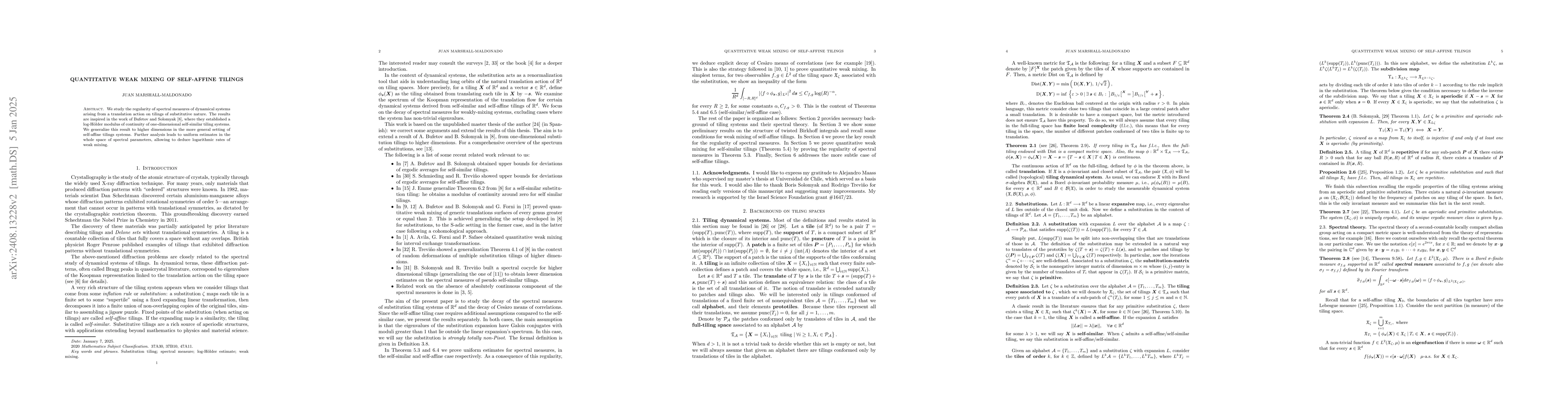 This paper generalizes the regularity of spectral measures in self-similar tiling systems to self-affine tiling systems, establishing uniform estimates and logarithmic rates of weak mixing for higher-dimensional dynamical systems arising from translation actions.