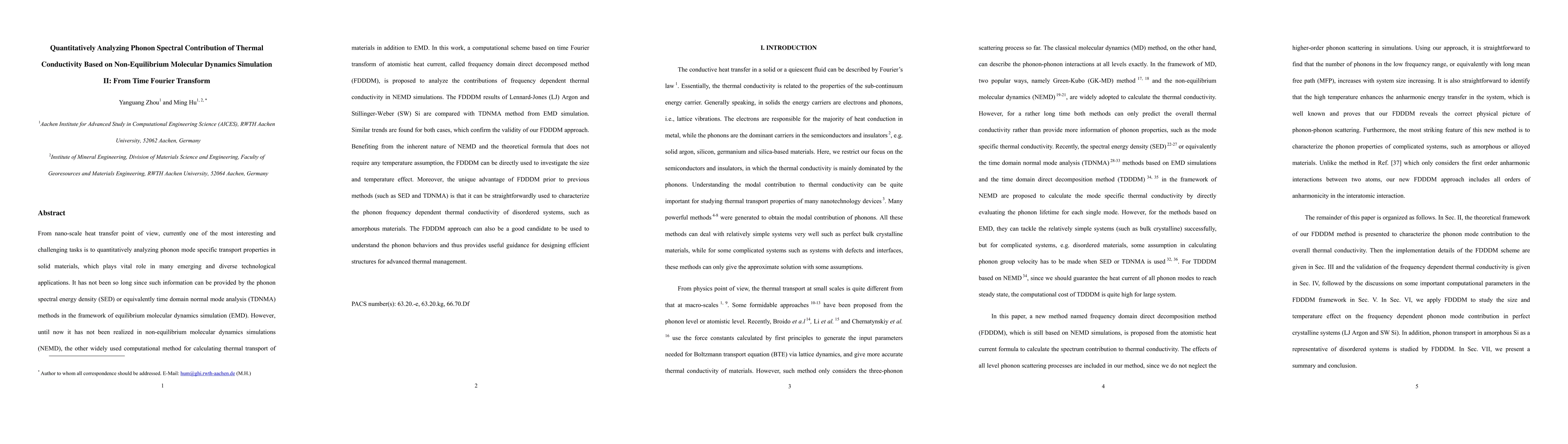 This paper proposes a new computational method, the frequency domain direct decomposed method (FDDDM), to analyze phonon spectral contributions to thermal conductivity in non-equilibrium molecular dynamics simulations. The method is validated using Lennard-Jones Argon and Stillinger-Weber Silicon, showing similar trends to equilibrium methods, and it can characterize disordered systems like amorphous materials.