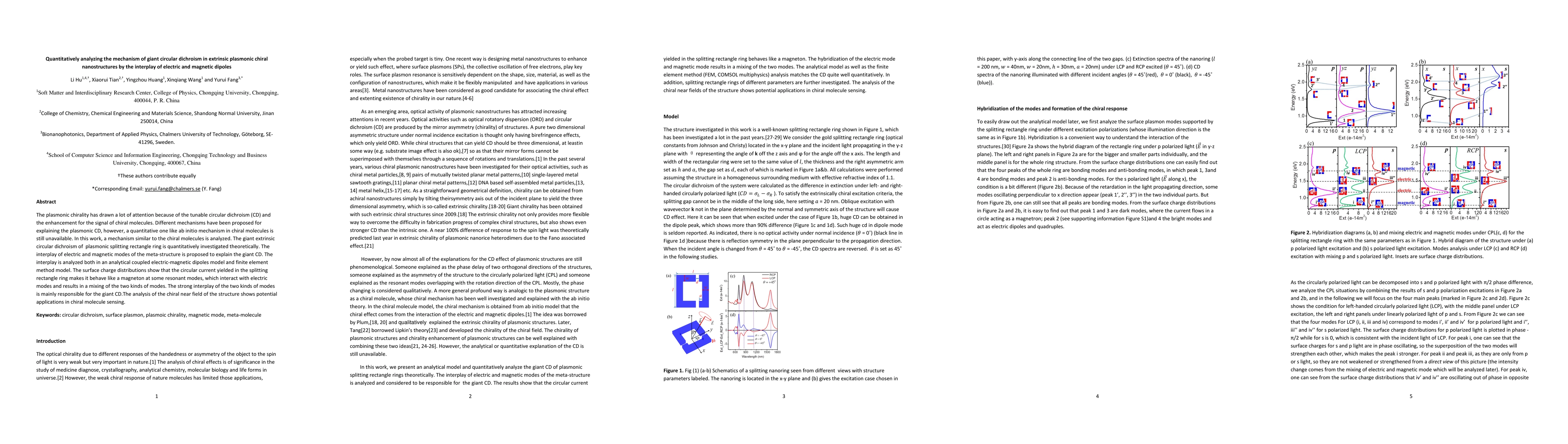 This paper quantitatively analyzes the mechanism behind giant circular dichroism in plasmonic chiral nanostructures, proposing that the interplay between electric and magnetic dipoles in a splitting rectangle ring is responsible for the observed phenomenon. The study uses both analytical and finite element models to demonstrate the mixing of electric and magnetic modes, which leads to the enhanced chiral response.