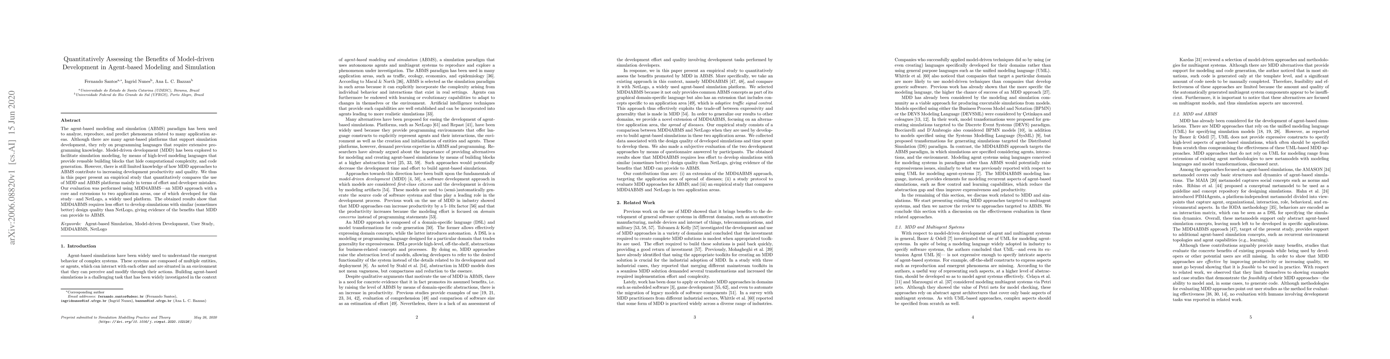 This empirical study compares Model-driven Development (MDD) and traditional Agent-based Modeling and Simulation (ABMS) platforms, finding that MDD requires less effort and maintains or improves design quality. The research utilized MDD4ABMS and NetLogo, demonstrating MDD's potential benefits for ABMS.