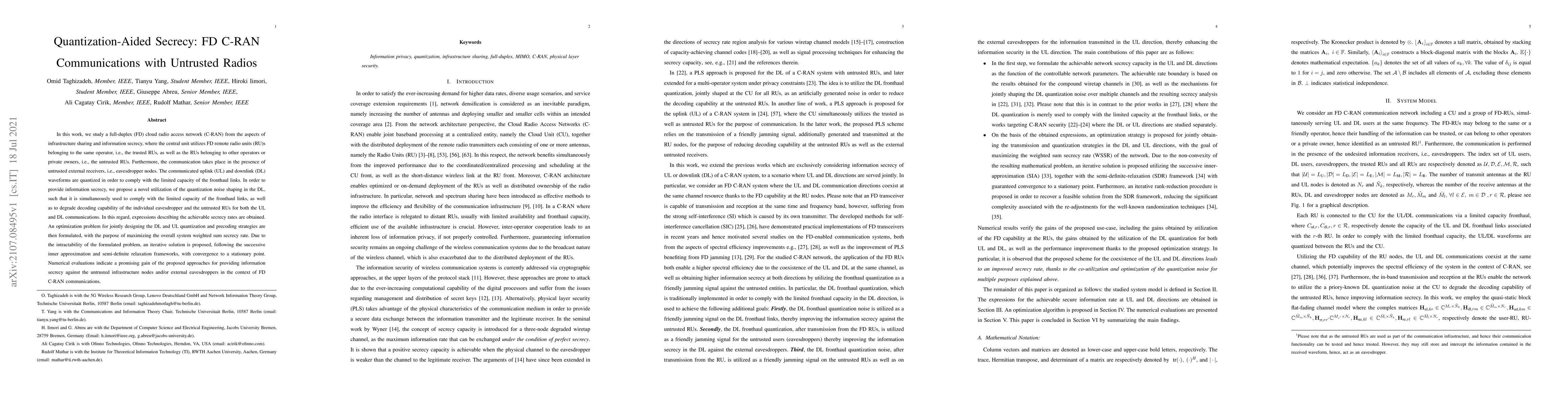 In this work, we study a full-duplex (FD) cloud radio access network (C-RAN) from the aspects of infrastructure sharing and information secrecy, where the central unit utilizes FD remote radio units (RU)s belonging to the same operator, i.e., the trusted RUs, as well as the RUs belonging to other operators or private owners, i.e., the untrusted RUs. Furthermore, the communication takes place in the presence of untrusted external receivers, i.e., eavesdropper nodes. The communicated uplink (UL) and downlink (DL) waveforms are quantized in order to comply with the limited capacity of the fronthaul links. In order to provide information secrecy, we propose a novel utilization of the quantization noise shaping in the DL, such that it is simultaneously used to comply with the limited capacity of the fronthaul links, as well as to degrade decoding capability of the individual eavesdropper and the untrusted RUs for both the UL and DL communications. In this regard, expressions describing the achievable secrecy rates are obtained. An optimization problem for jointly designing the DL and UL quantization and precoding strategies are then formulated, with the purpose of maximizing the overall system weighted sum secrecy rate. Due to the intractability of the formulated problem, an iterative solution is proposed, following the successive inner approximation and semi-definite relaxation frameworks, with convergence to a stationary point. Numerical evaluations indicate a promising gain of the proposed approaches for providing information secrecy against the untrusted infrastructure nodes and/or external eavesdroppers in the context of FD C-RAN communications.