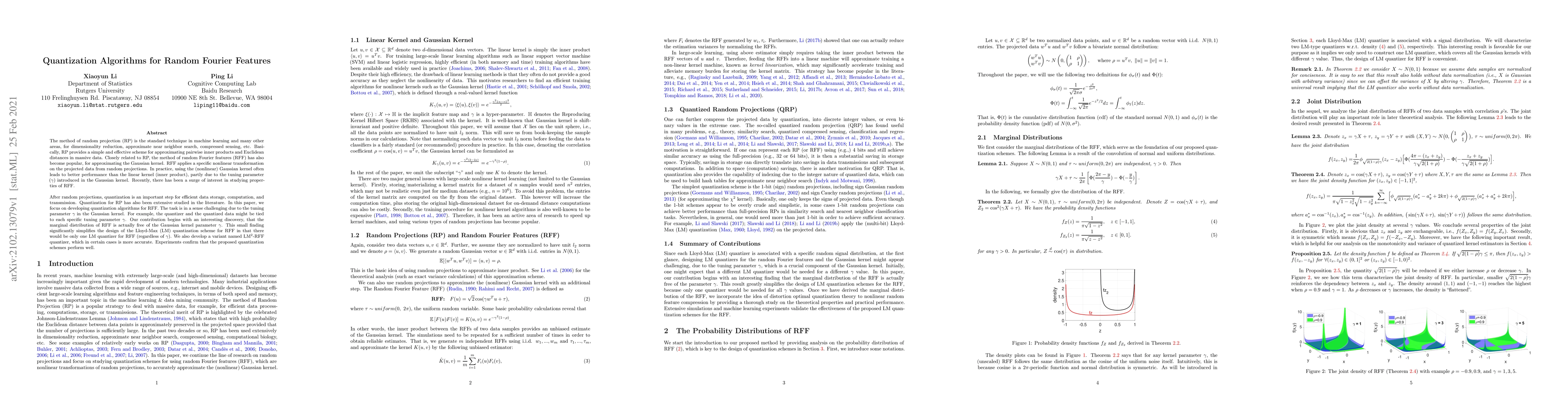 The method of random projection (RP) is the standard technique in machine learning and many other areas, for dimensionality reduction, approximate near neighbor search, compressed sensing, etc. Basically, RP provides a simple and effective scheme for approximating pairwise inner products and Euclidean distances in massive data. Closely related to RP, the method of random Fourier features (RFF) has also become popular, for approximating the Gaussian kernel. RFF applies a specific nonlinear transformation on the projected data from random projections. In practice, using the (nonlinear) Gaussian kernel often leads to better performance than the linear kernel (inner product), partly due to the tuning parameter $(\gamma)$ introduced in the Gaussian kernel. Recently, there has been a surge of interest in studying properties of RFF. After random projections, quantization is an important step for efficient data storage, computation, and transmission. Quantization for RP has also been extensive studied in the literature. In this paper, we focus on developing quantization algorithms for RFF. The task is in a sense challenging due to the tuning parameter $\gamma$ in the Gaussian kernel. For example, the quantizer and the quantized data might be tied to each specific tuning parameter $\gamma$. Our contribution begins with an interesting discovery, that the marginal distribution of RFF is actually free of the Gaussian kernel parameter $\gamma$. This small finding significantly simplifies the design of the Lloyd-Max (LM) quantization scheme for RFF in that there would be only one LM quantizer for RFF (regardless of $\gamma$). We also develop a variant named LM$^2$-RFF quantizer, which in certain cases is more accurate. Experiments confirm that the proposed quantization schemes perform well.