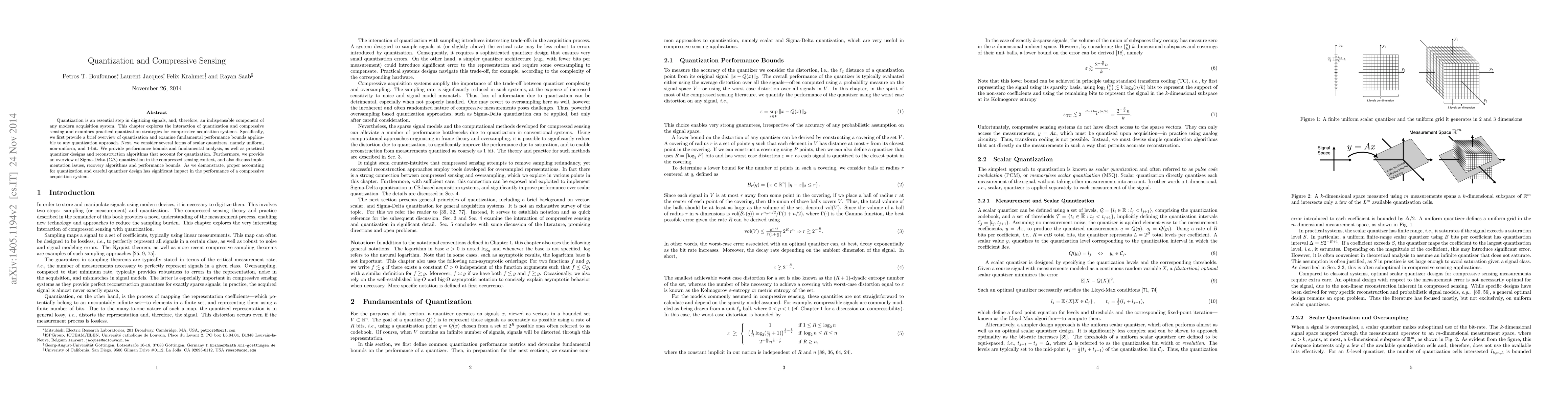 This research paper explores the interaction between quantization and compressive sensing in acquisition systems, providing performance bounds, practical strategies, and implications for system design.