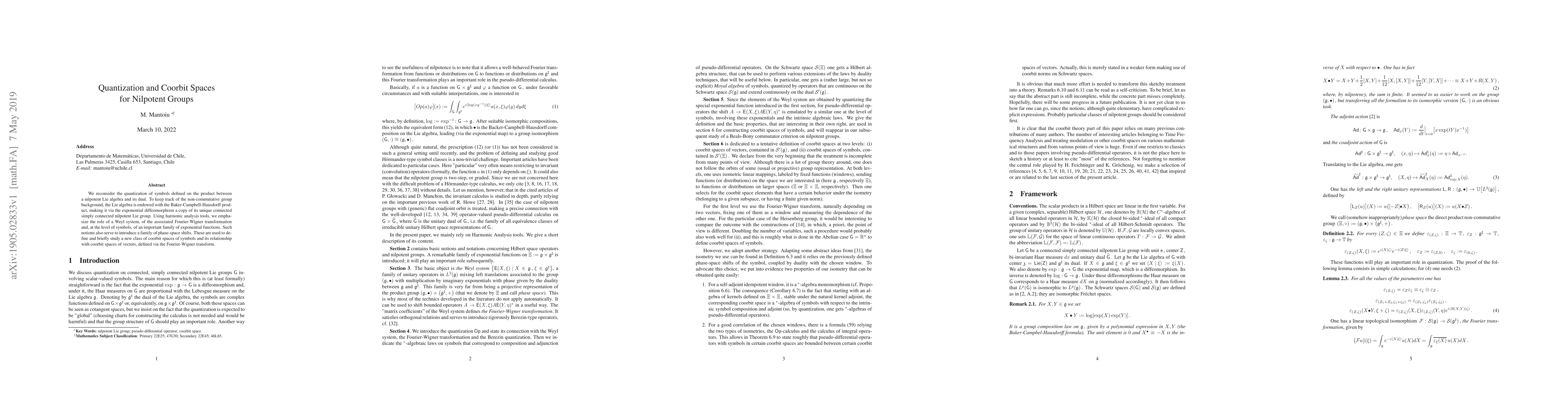 We reconsider the quantization of symbols defined on the product between a nilpotent Lie algebra and its dual. To keep track of the non-commutative group background, the Lie algebra is endowed with the Baker-Campbell-Hausdorff product, making it via the exponential diffeomorphism a copy of its unique connected simply connected nilpotent Lie group. Using harmonic analysis tools, we emphasize the role of a Weyl system, of the associated Fourier-Wigner transformation and, at the level of symbols, of an important family of exponential functions. Such notions also serve to introduce a family of phase-space shifts. These are used to define and briefly study a new class of coorbit spaces of symbols and its relationship with coorbit spaces of vectors, defined via the Fourier-Wigner transform.