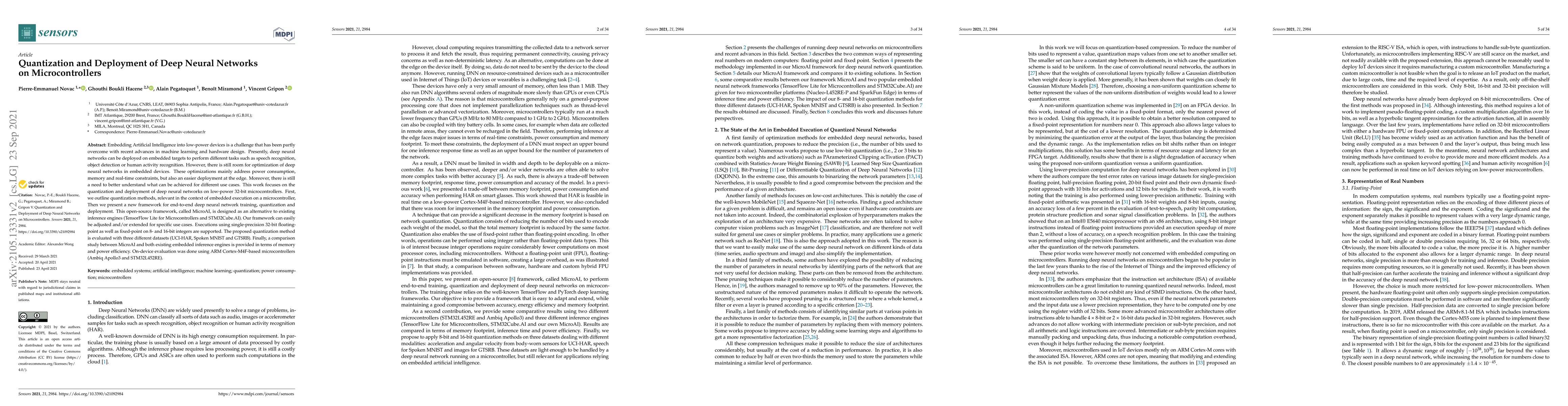 This paper presents a new framework, MicroAI, for training, quantizing, and deploying deep neural networks on low-power microcontrollers to optimize power consumption and memory usage. It evaluates the framework against existing inference engines on various datasets and microcontrollers, demonstrating improvements in efficiency.