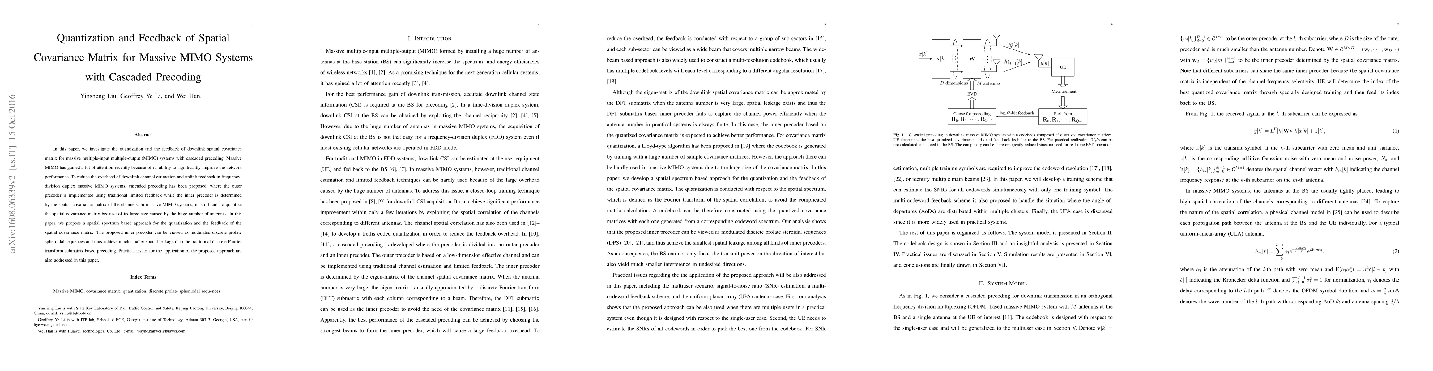 This paper proposes a spatial spectrum-based approach for quantizing and feeding back the spatial covariance matrix in massive MIMO systems with cascaded precoding, aiming to reduce overhead and improve network performance. The method achieves lower spatial leakage compared to traditional precoding techniques.