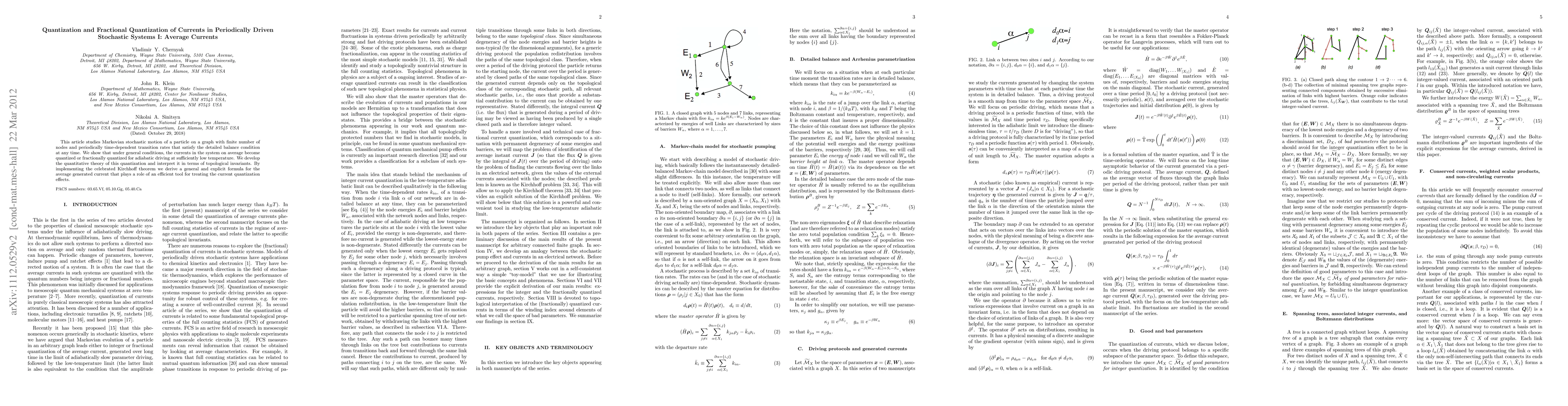 This paper investigates Markovian stochastic motion in periodically driven systems, demonstrating that under adiabatic driving and low temperatures, average currents become quantized or fractionally quantized. It develops a quantitative theory and derives a formula for the average generated current based on topological invariants.