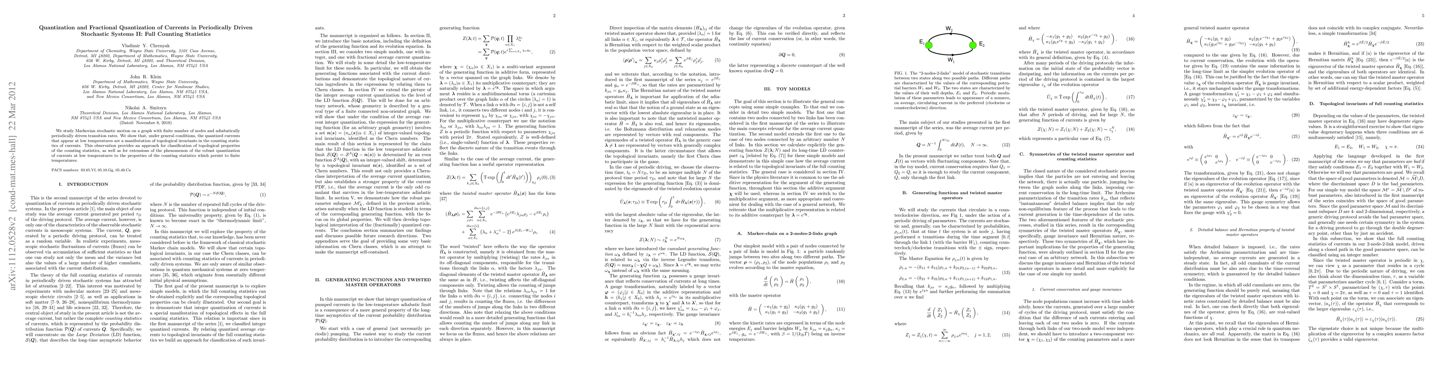 This paper investigates Markovian stochastic motion on a graph under periodic driving, revealing that quantized currents at low temperatures reflect topological invariants in current counting statistics. The findings offer a method for classifying topological properties and extending robust current quantization to finite temperatures.