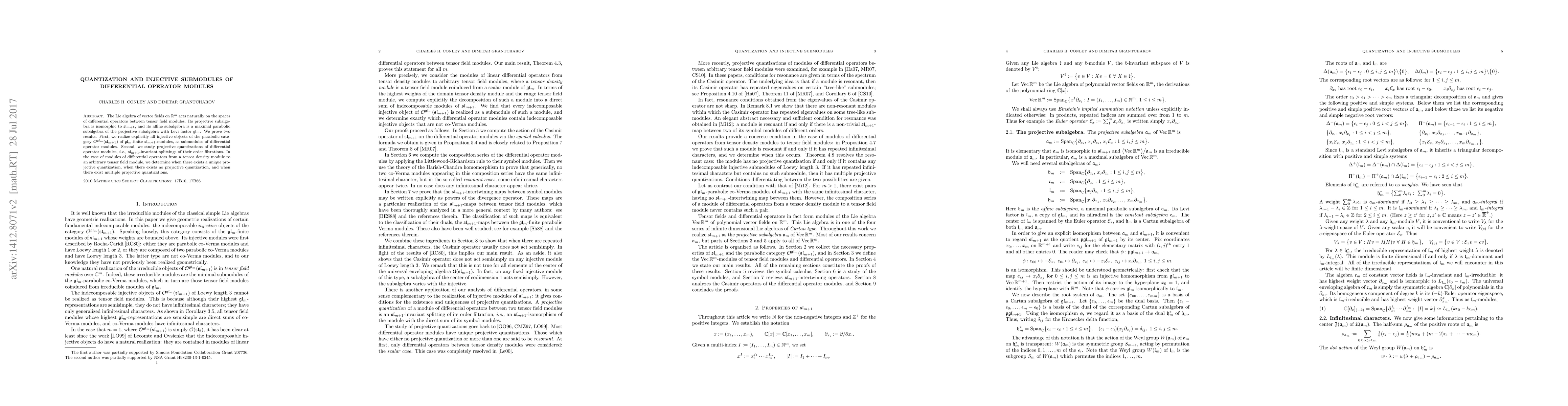 This paper explores the injective submodules of differential operator modules and their quantization. It proves that all injective objects in a specific category of modules can be realized as submodules of differential operator modules. Additionally, it investigates projective quantizations of these modules, determining conditions for unique, non-existent, or multiple quantizations.