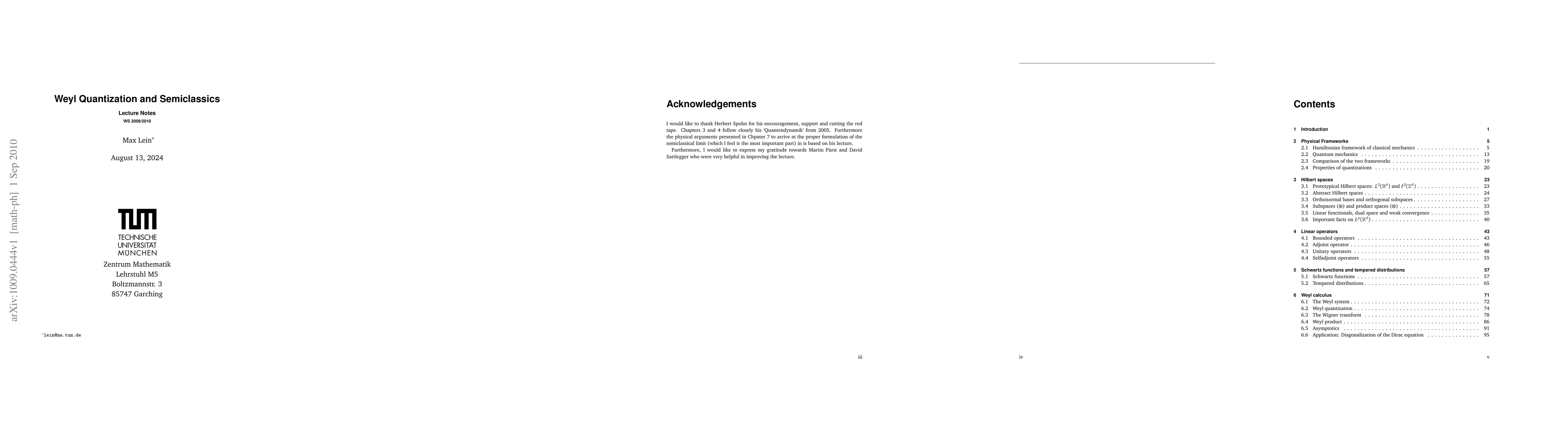 This course is aimed at graduate students in physics in mathematics and designed to give a comprehensive introduction to Weyl quantization and semiclassics via Egorov's theorem. Chapter 2 gives a quick overview of classical and quantum mechanics on R^d. Some mathematical preliminaries concerning Hilbert space theory, operator theory and tempered distributions are detailed in Chapters 3-5. Weyl quantization and semiclassics are the content of Chapters 6 and 7. Finally, an application of Weyl calculus to Born-Oppenheimer systems is discussed in Chapter 8.
